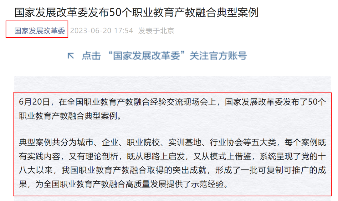 6月20日,国家发展改革委发布了50个职业教育产教融合典型案例,best365官网“构建‘1+3+N’产教融合模式 深耕先进装备制造业 培育忠诚工匠 ”作为典型案例入选。