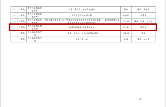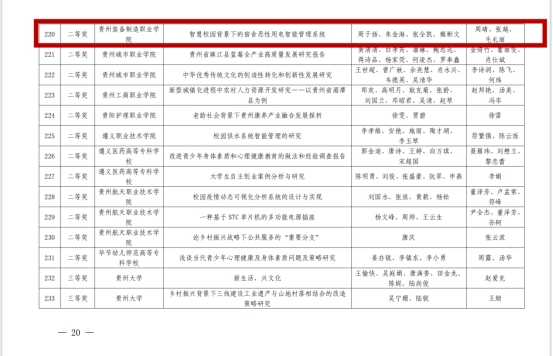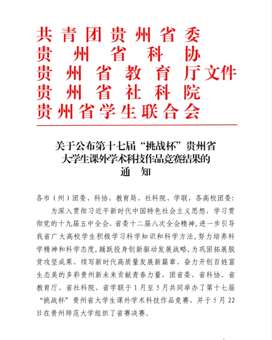 近日,第十七届“挑战杯”贵州省大学生课外学术科技作品竞赛活动圆满落下帷幕,best365官网取得优异成绩。根据团省委等五单位联合下发的《关于公布第十七届“挑战杯”贵州省大学生课外学术科技作品竞赛结果的通知》,在此次全省竞赛中best365官网共获奖3项,其中二等奖2项,三等奖1项。获奖的项目涉及科技发明制作和红色专项赛两个领域。此次比赛,学院领导高度重视、认真部署,团委、科研处精心策划,各系部积极落实,各项目指导教师倾力指导。无论是参赛作品数还是参赛人数与往届相比都有了非常大的突破,在此,向获奖团队成员和指导老师们表示热烈祝贺!具体获奖名单如下: