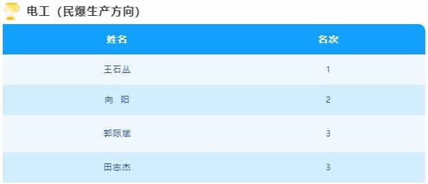 经过数轮紧张有序的比拼,最终揭晓了前三名的归属。民爆生产民爆行业电工类主要体现参赛选手细致入微的电路连接与排查较量, 每一个瞬间都让人热血沸腾, 生动展现了参赛选手们精湛的技艺、 顽强的拼搏精神和高度的专业素养。