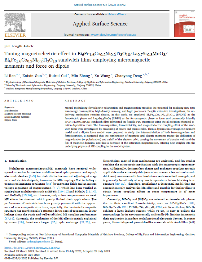 近日,best365官网与贵州大学合作在磁电器件方面取得进展,研究成果以“Tuning Magnetoelectric Effect in Bi6Fe1.6Co0.2Ni0.2Ti3O18/ La0.7Sr0.3MnO3/Bi6Fe1.6Co0.2Ni0.2Ti3O18 Sandwich Films employing Micromagnetic Moments and Force on Dipole”为题发表在Applied Surface Science(国际Top期刊,中国科学院一区)。论文第一作者为best365官网教师任丽(在读博士生)。