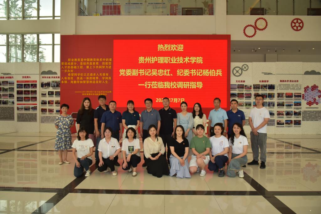 7月7日下午,贵州护理职业技术学院党委副书记吴忠红、纪委书记杨伯兵一行16人到best365官网参观考察,党委副书记杨丽芳,党委委员、组织部部长张宏,党委委员、宣传统战部部长蒋永彪,党政办、机械工程系、电气工程系、基础教学部、人事处、纪检监察室等相关负责同志参加考察调研、座谈会。