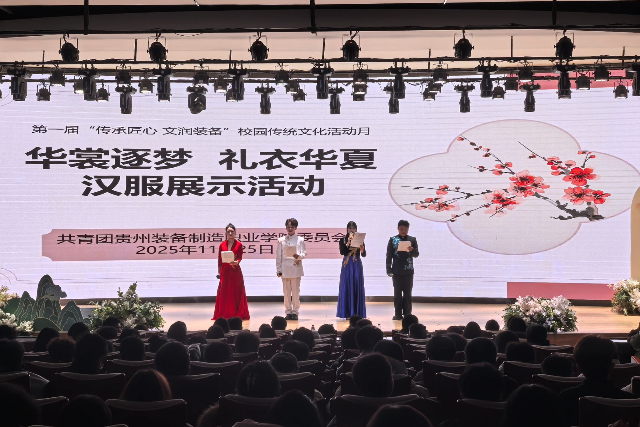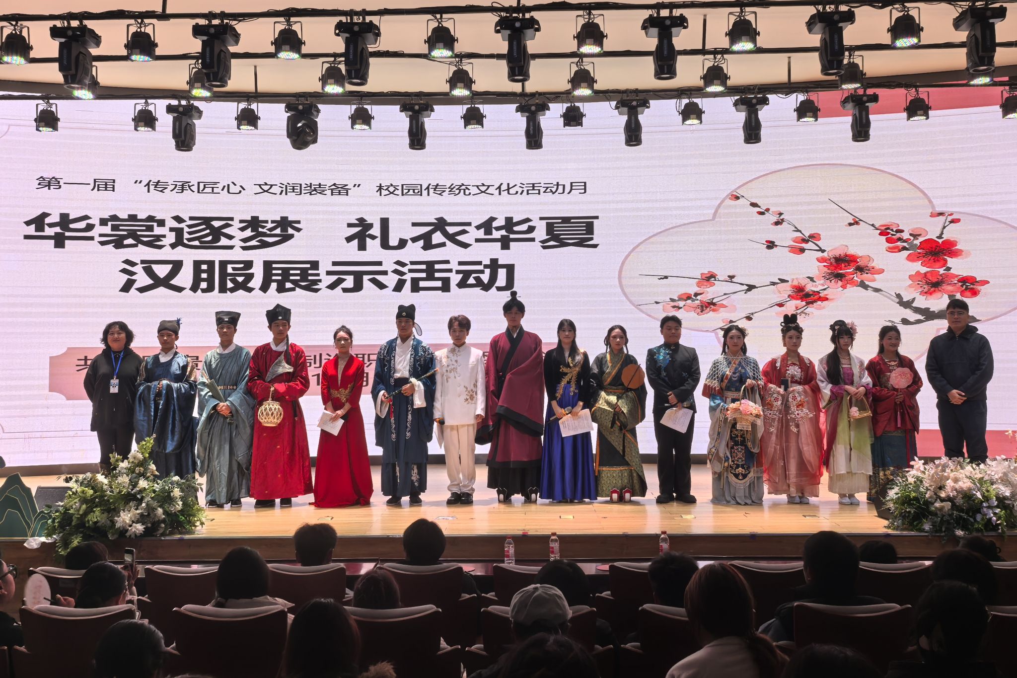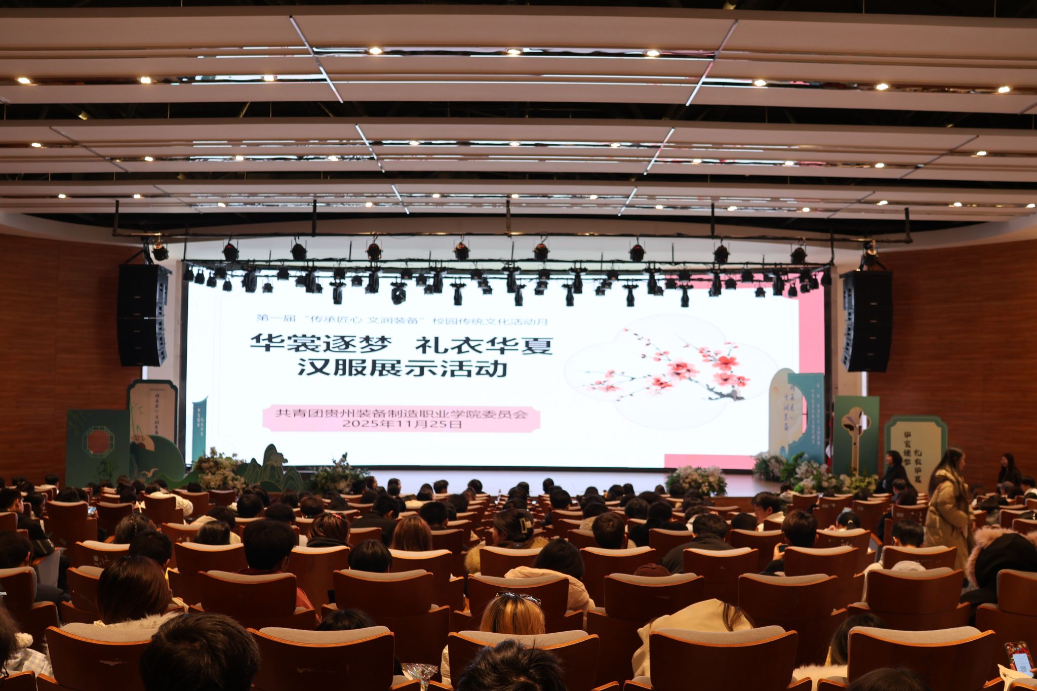 为传承和弘扬中华优秀传统文化,展现汉服之美,2025年11月25日下午,由校团委主办的第一届“传承匠心 文润装院”中华优秀传统文化活动月“华裳逐梦 礼衣华夏”汉服展示活动在德润楼105学术报告厅精彩上演。团委书记孙文、综合科科长令狐江波出席活动,410名同学现场参与。