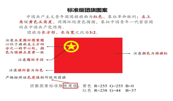 团的各级组织举办团日活动和面向社会开展重要活动,可以使用团旗。团的各级组织的新媒体平台,可以使用等比例制作的团旗图案。