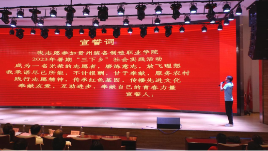 出征仪式上,学院党委副书记杨丽芳同志宣读了学院2023年暑期文化科技卫生“三下乡”社会实践队伍名单,并强调,志愿服务是实践育人的重要载体,未来一段时间里,在党旗的指引下,团旗的号召下,全院20支队伍,近200名青年师生将会用他们的足迹遍及遵义、六盘水、安顺、荔波、台江等地,将装院青年学子朝气蓬勃的身影活跃在各个实践活动中。希望同学们通过参加社会实践活动,用心去体会,用脚步去丈量乡村大地,在志愿服务过程中宣传贯彻习近平新时代中国特色社会主义思想,坚定理想信念,厚植家国情怀,提升国情民情认知,培养与人民群众的真挚感情,不断增强服务社会、奉献家乡的使命感和责任感。希望参与暑期文化科技卫生“三下乡”的20支社会实践队伍,走进社区、走进乡村、走进基层,发扬艰苦精神,拼搏奋斗的精神,用青春的激情奏响“清澈的爱、只为中国”的时代强音,用青春的行动践行“请党放心、强国有我”的铮铮誓言。