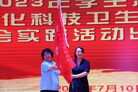 党委副书记杨丽芳老师为经济管理系暑期“三下乡”社会实践活动队伍授旗