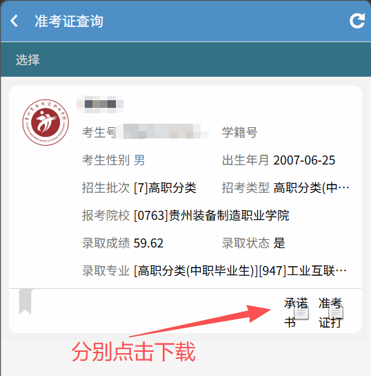 三、在招生管理系统界面,选择“准考证查询”-输入姓名和身份证号,点击“登录”—进入个人信息页面—分别点击准考证打印、承诺书按钮进行文件下载即可。
