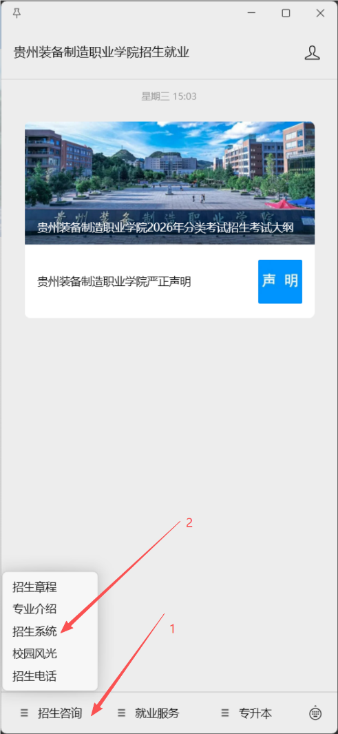 二、在该服务号界面,点击“发消息”—点击左下角“招生咨询”—选择“招生系统”。