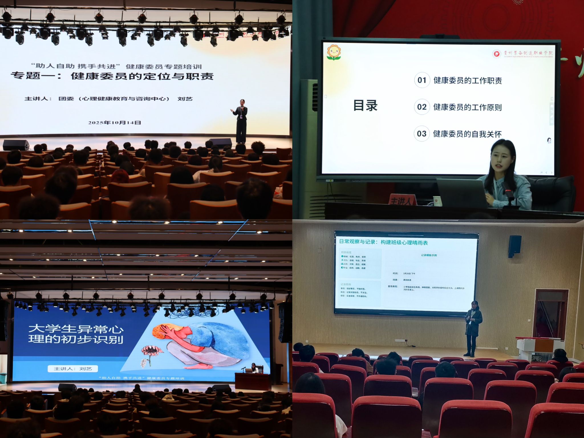 为提升best365官网健康委员的助人能力与责任意识,夯实“学校—系部—班级—宿舍”四级心理预警网络,团委(心理健康教育与咨询中心)于10月14日至10月28日组织开展了“助人助心 携手共进”健康委员专题培训,本次培训共开展四场专题课程,内容涵盖角色职责、心理问题识别、朋辈倾听技巧与危机干预流程等内容。2024级、2025级全体健康委员参加了本次培训,培训过程中,健康委员们认真听讲、积极互动,进一步明确了自身在班级心理健康教育工作中的定位与使命,为后续开展班级心理互助工作奠定了坚实基础。