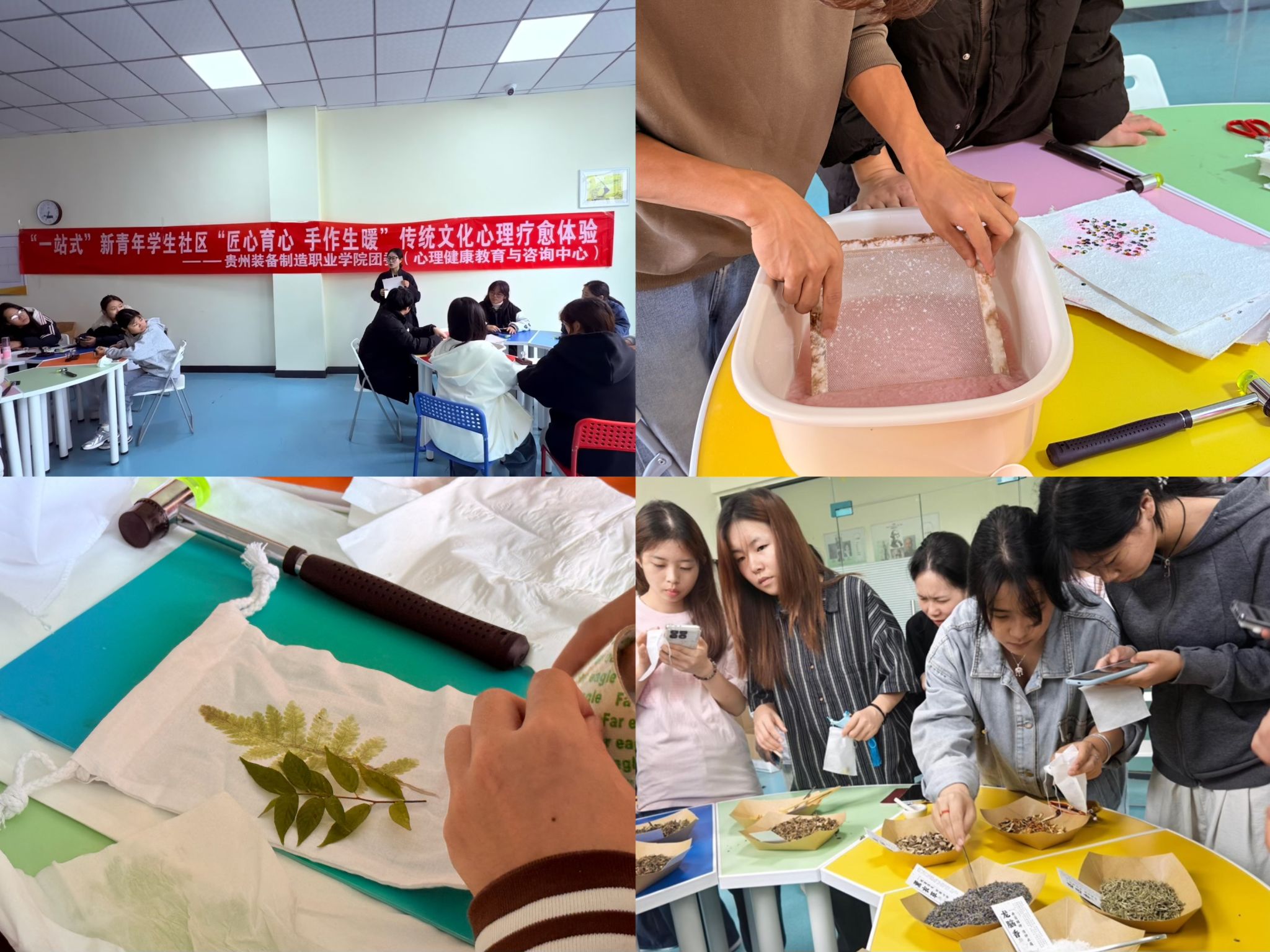 为帮助学生舒缓压力,放松身心,在手工制作中实现情绪表达与自我探索,团委(心理健康教育与咨询中心)于10月16日至30日组织开展了“匠心育心 手作生暖”传统文化心理疗愈体验系列活动,活动分三场进行,包括“中药香囊手作” “古法造纸体验”和“植物拓染创作”,145名同学报名参与,在活动中亲手制作了专属的手工作品,本次活动不仅帮助同学们缓解了日常压力,也增强了专注力与创造力,实现了“以美润心、以文化人”的育人目标。