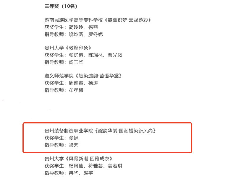 在“赤子之声·青春共鸣”全省大中小学联唱快闪大赛中,由孙文、令狐江波、梁峥颖三位老师共同指导的快闪作品《祖国不会忘记》荣获二等奖;在“多彩创意·潮赋新生”全省大学生文化创新设计大赛之国潮服饰系列赛中,由梁艺老师指导、张娟同学创作的作品《靛韵华裳·国潮蜡染新风尚》荣获三等奖。