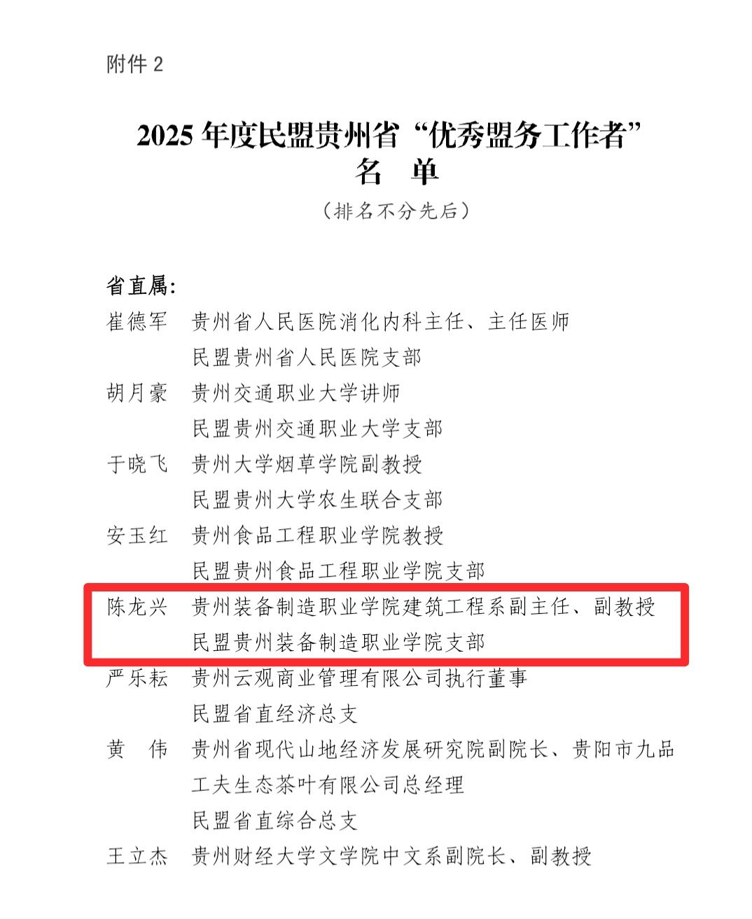 2025年12月30日,民盟贵州省委印发关于表彰2025年度先进基础组织和优秀个人的决定,民盟best365官方网站支部获2025年度民盟贵州省“参政议政先进基层组织”,best365官网建筑工程副主任、副教授陈龙兴获2025年度民盟贵州省“优秀盟务工作者”。