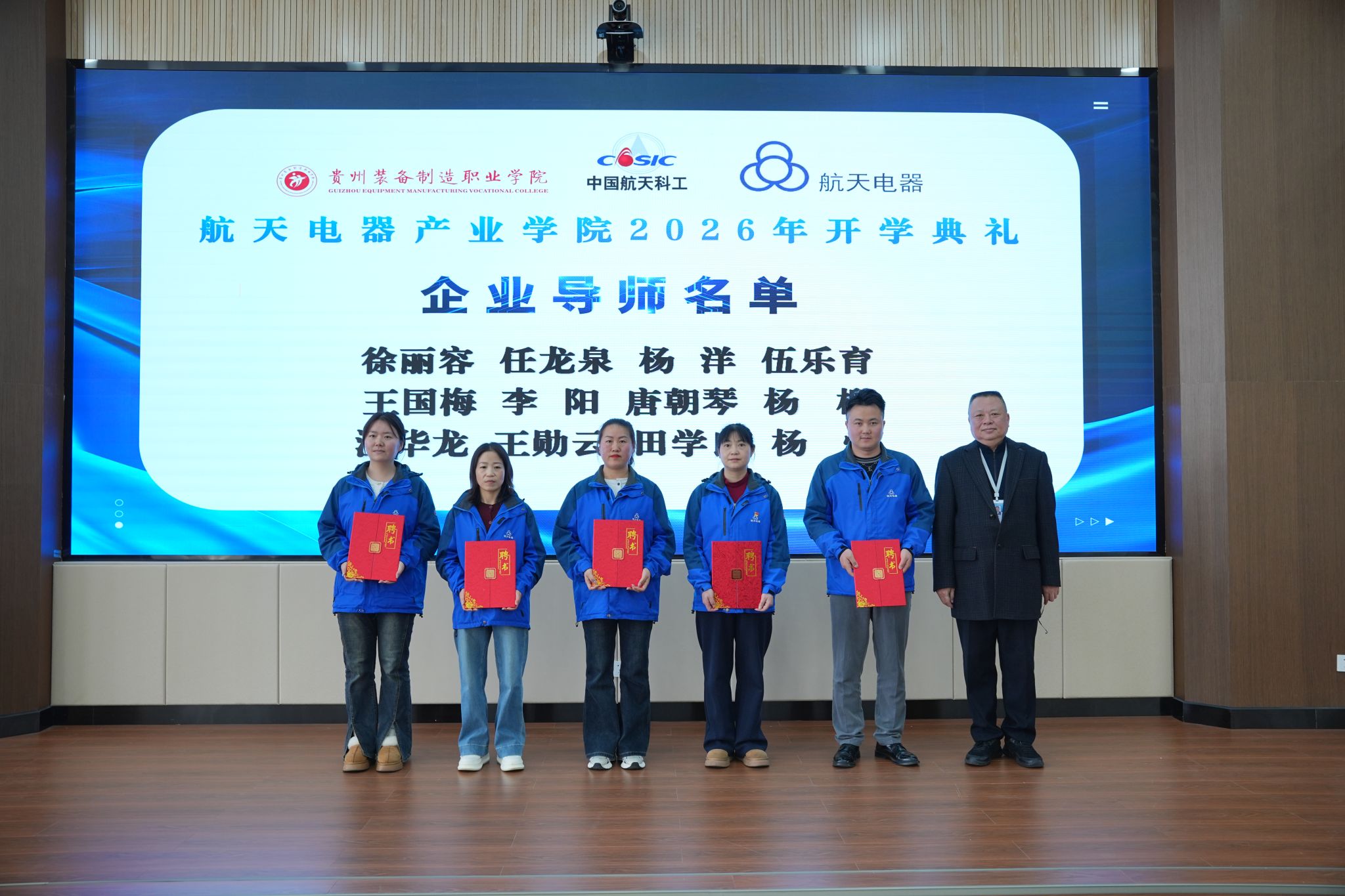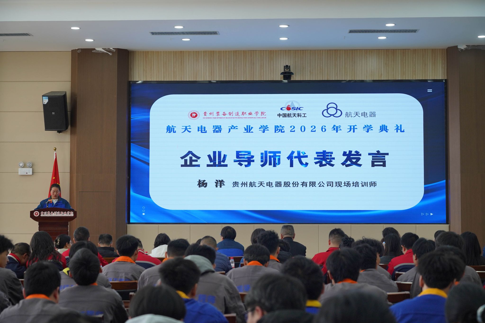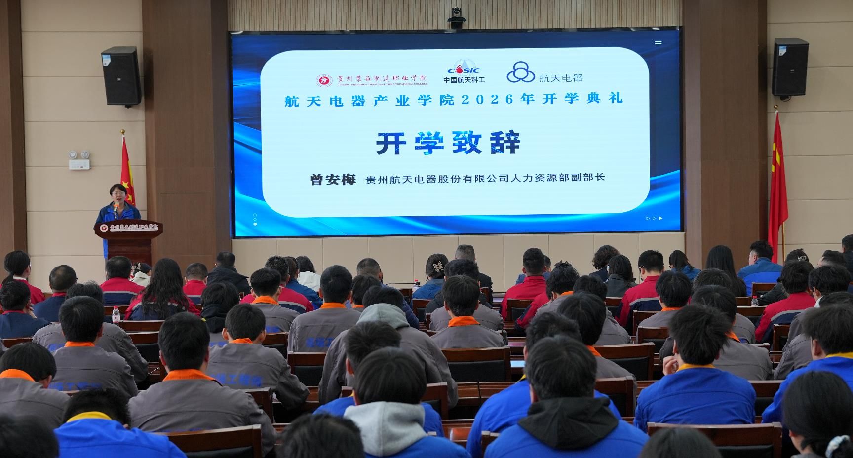 2026年3月10日下午,best365官网与贵州航天电器股份有限公司共建的“航天电器产业学院”2026年开学典礼暨“航天未来”奖学金颁发仪式隆重举行。学院党委书记杨志宏,学院党委委员、副院长孔杰,学院党委委员、副院长李秀丽,贵州航天电器股份有限公司人力资源部副部长曾安梅,企业技能大师徐利容,贵州财经职业学院党委委员、副院长肖燕等校企双方领导、嘉宾出席仪式,2024级、2025级“现场工程师班”全体学员及受聘校企导师代表参加活动,仪式由机械工程系党总支副书记、系主任杨林主持。