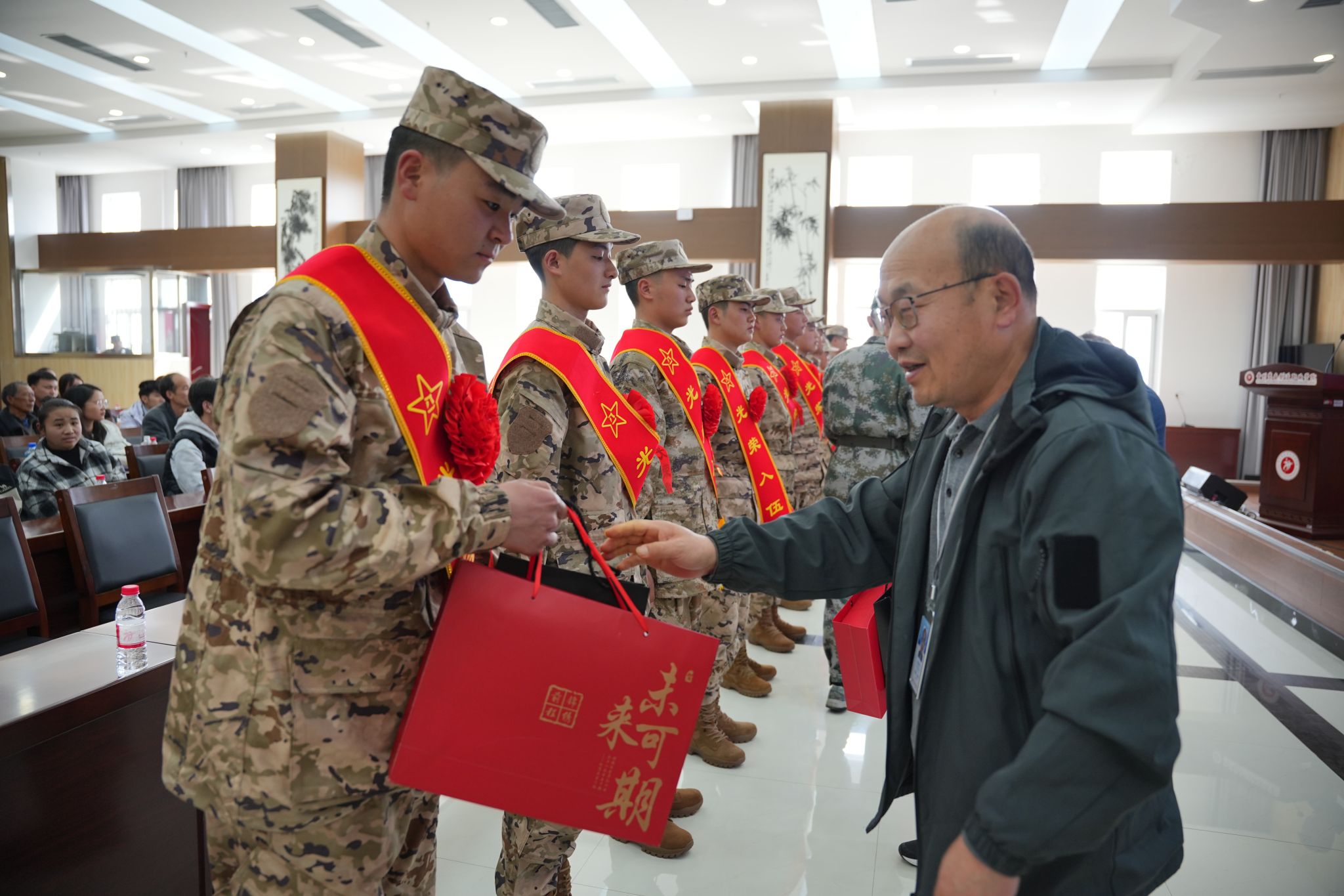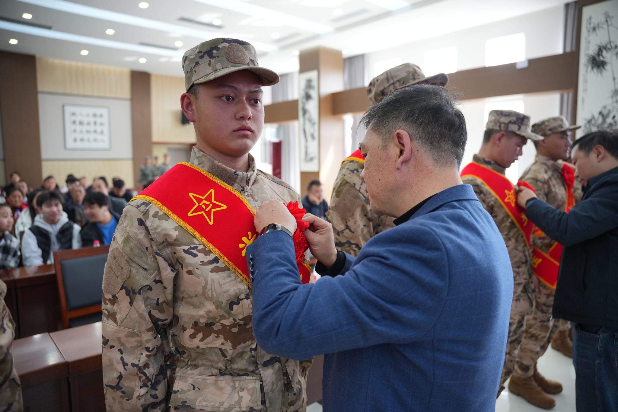 会上,学院党委委员张黔成宣读了2026年春季预定新兵名单。随后,与会领导为入伍学子佩戴荣誉红花、赠送纪念品,这份沉甸甸的礼物承载着学院对学子们的殷切期盼与深切牵挂。退役大学生代表马振超结合自身服役经历,分享了从校园到军营的蜕变感悟,他激励应征同学们:“军营是最好的成长课堂,唯有坚守与拼搏方能淬火成钢”,朴实的话语赢得现场阵阵掌声。