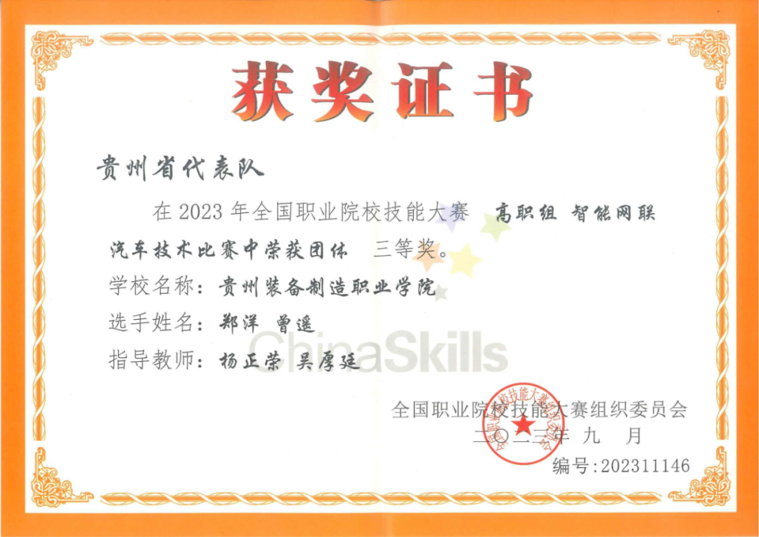 9月27日,2023年全国职业院校技能大赛(高职组)“智能网联汽车技术”赛项在天津职业大学圆满落幕。来自全国各省、自治区、直辖市和新疆生产建设兵团的60支参赛队伍参加赛事活动。经过两天的激烈角逐,best365官网汽车工程系2020级新能源汽车技术(4)班学生郑洋、2022级新能源汽车技术(2)班学生曾遥同学组成的团体队荣获2023年全国职业院校技能大赛(高职组)智能网联汽车技术赛项三等奖,指导老师杨正荣、吴厚廷。