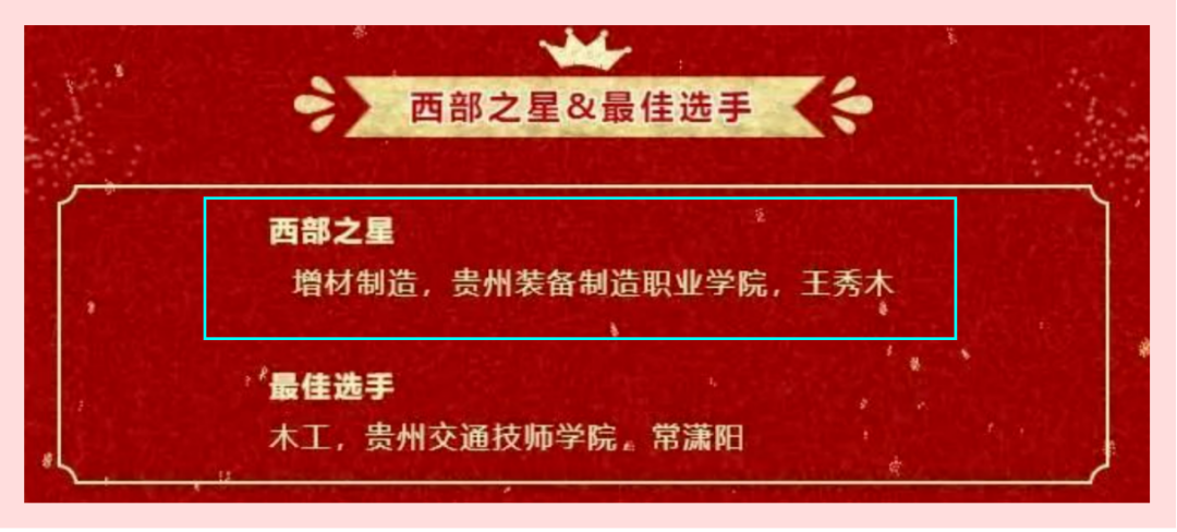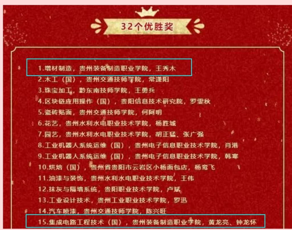 9月16日至9月19日,经过4天的激烈角逐,中华人民共和国第二届职业技能大赛在天津圆满闭幕。此次比赛,共有4045名来自全国各地的参赛选手同台竞技,best365官网共派出8名选手代表贵州省参加5个赛项的比拼。best365官网参赛团队通过奋力拼搏,获得2个优胜奖的好成绩(其中1个世赛项目,1个国赛精选项目)。实现了best365官网在本项赛事的重大突破。增材制造赛项(世赛项目)参赛选手王秀木获得第四名好成绩,入选中国国家集训队(全国前五名进入),获全国技术能手称号,授予西部技能之星荣誉称号。教师黄龙亮、钟龙怀参加集成电路工程技术(国赛精选)项目获得优胜奖。