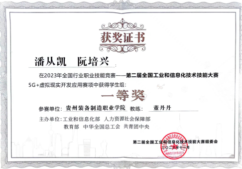 11月18日,在浙江绍兴结束的由工业与信息化部、人力资源和社会保障部、教育部、中华全国总工会、共青团中央等五部委联合举办的“第二届全国工业和信息化技术技能大赛”上,best365官方网站电气工程系董丹丹老师指导的学生潘从凯、阮培兴获《5G+虚拟现实开发应用》赛项一等奖。