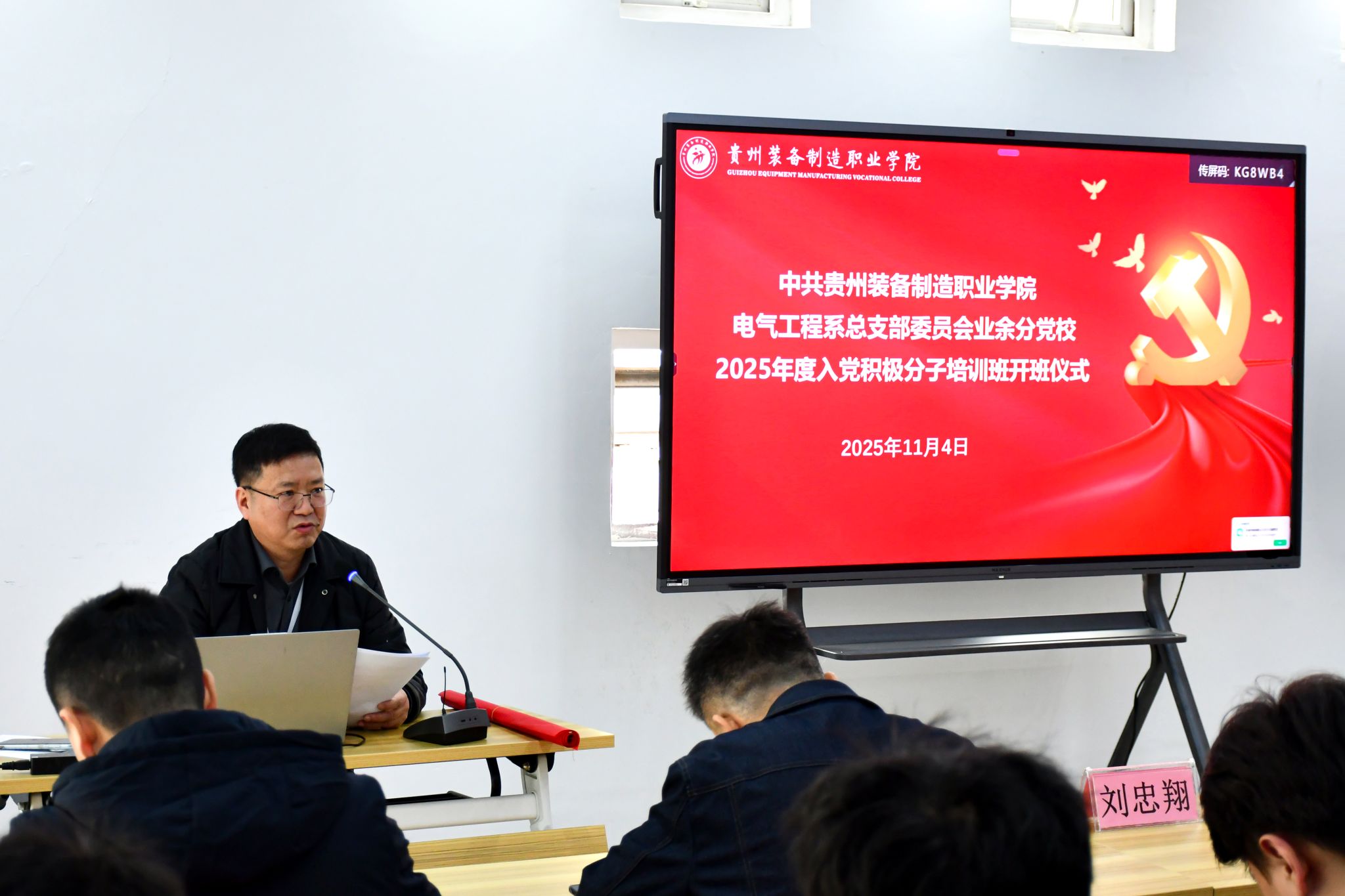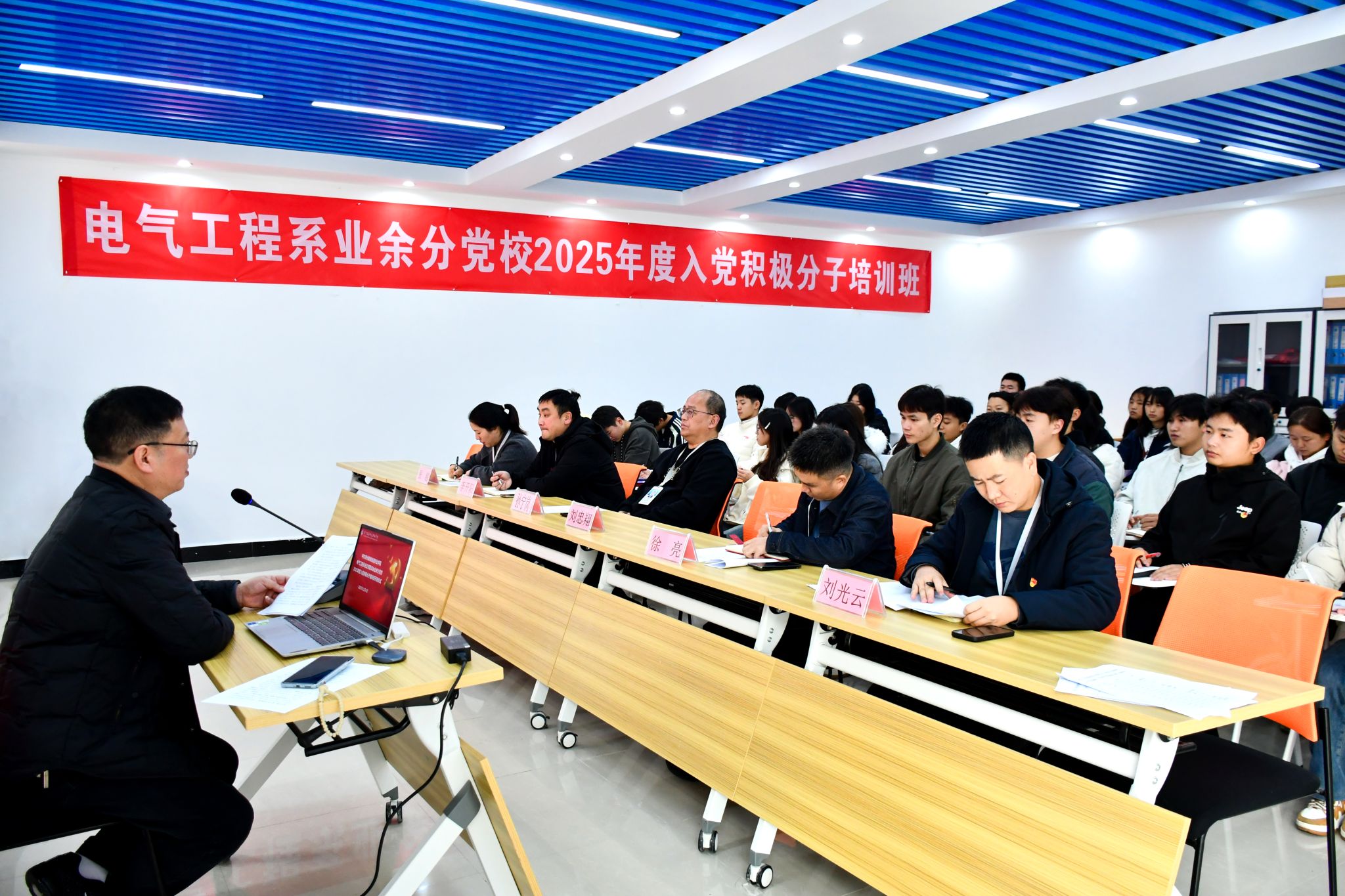 为加强入党积极分子队伍建设,端正学员入党动机,提升思想政治素养。11月4日,电气工程系业余分党校2025年度入党积极分子党课培训班开班仪式在竹苑“一站式”新青年社区服务中心顺利举行。学院党委委员、副院长孙宁岗,系党总支书记、主任刘忠翔出席本次开班仪式,系部班子成员、辅导员教师及全体入党积极分子学员共同参与。开班仪式由学生党支部书记由郦主持。