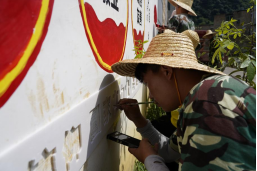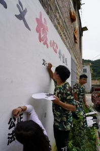 7月17日上午,吃过早餐后的队员们便带着自己的绘画工具赶往村民组的墙面,接下来的几个小时,这面墙便是他们的主要“战场”,没有绿阴植被的遮盖保护,没有透心凉水的解暑,也没有舒适休息的椅子,墙绘小组队员克服气温高、天气炎热的困难,晒着太阳,规划墙面,共同设计和描绘。