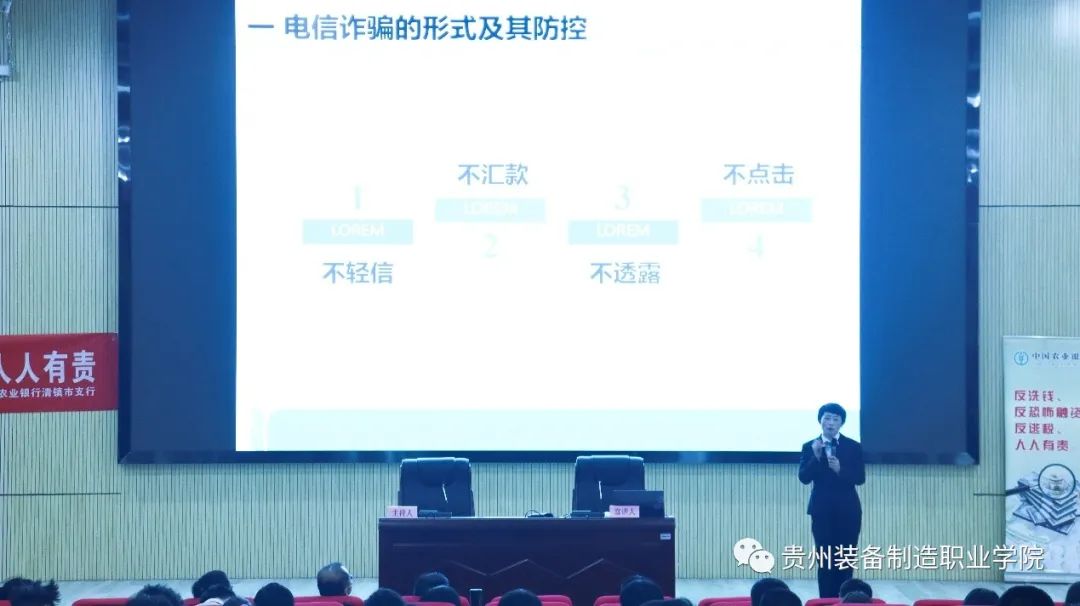 “诚信是道德准则,征信则是规则约束”。中国农业银行贵阳支行个人金融部汪雪花经理以《“斩断黑手,净化校园”——校园金融诈骗及防控》为主题,详细讲解了征信对每个人意义及重要性。她说,如今信用报告已成为人们的“第二张身份证”;同学们应重视个人征信,维护良好个人信用,避免贷款还款逾期等行为。作为大学生要提高自控能力,树立正确的消费观,加强个人财商训练、个人账户管理及个人征信管理,维护好个人的金融信用,为今后工作、生活、家庭等奠定良好的基础。汪经理还介绍了非法校园贷的类别和危害,让同学们充分了解了不良贷款的推广运作形式和可怕后果,希望同学们能做到“远离校园贷,青春无外债”。