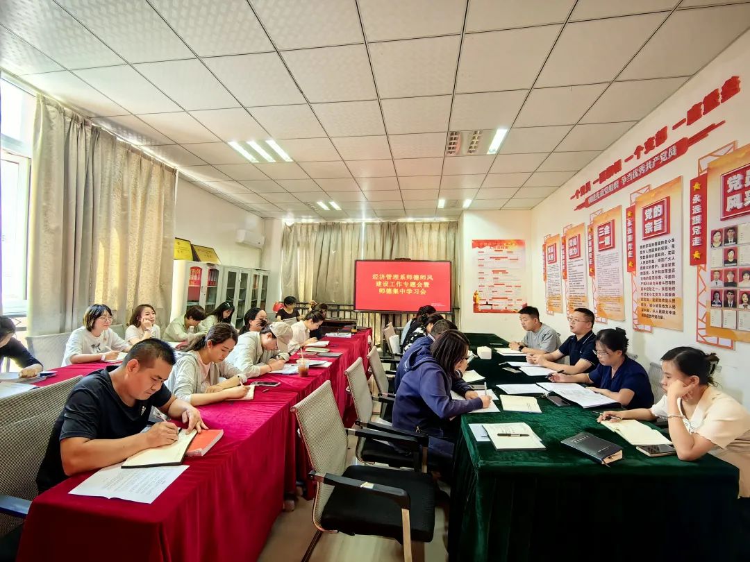 8月31日下午,经济管理系在博文楼315召开师德师风建设工作专题暨师德师风集中学习会。深入推进《中共中央国务院关于全面深化新时代教师队伍建设改革的意见》的实施,加强和改进系部教师师德师风建设,加强教师队伍建设,提升教师师德素养和专业水平,努力培养和造就一支德才兼备、充满活力的高素质教师队伍。经济管理系全体教师参加,会议由系党总支书记蒋永彪主持。