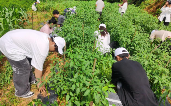 大学生志愿者们在村民辣椒地里清除杂草