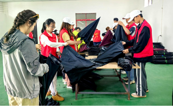 在林哨村制伞加工厂,志愿者们纷纷加入制伞工作。与制工人师傅一起边学边做,从裁缝、合片、装珠到上骨、再到组装和品检等各个工序,大家都认真学习并进行实践。通过学习了解,同学们了解了每个制伞工序所产生的人工成本,并纷纷表示,在在今后的学习中,认真研究生产成本的核算以及生产工艺,发挥创新思维,为提高劳动生产率,增加产品附加值等而贡献力量。