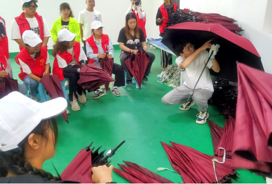 大学生志愿者们在林哨村制伞加工基地学习并参加实践
