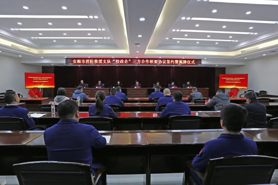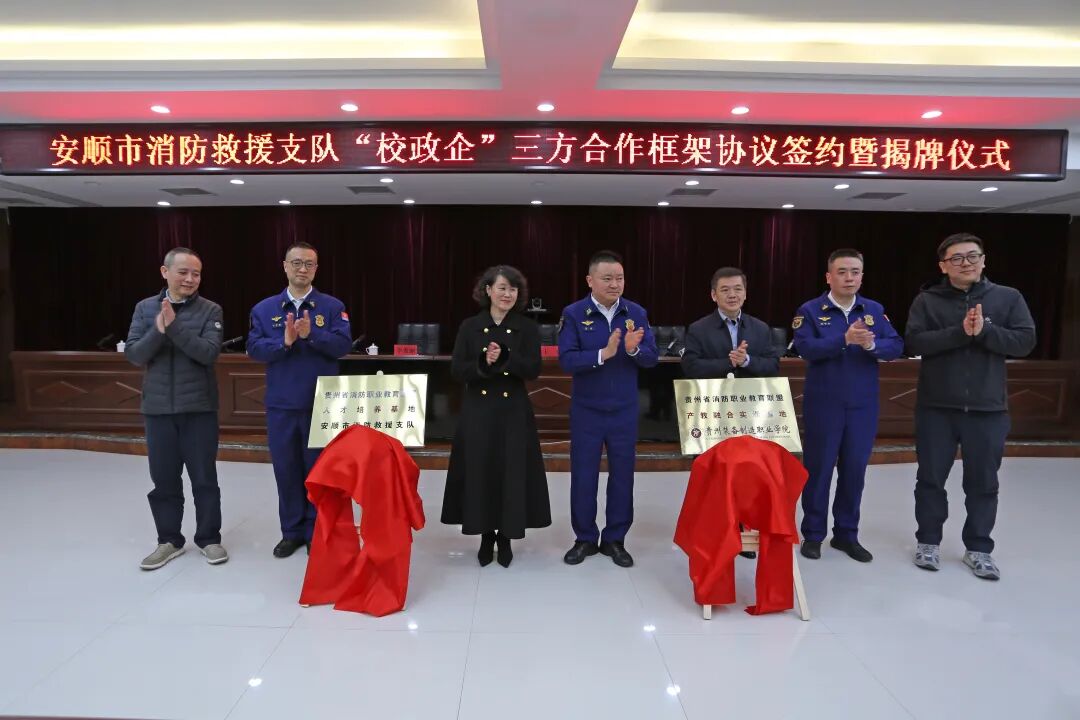 1月19日下午,best365官方网站与安顺市消防救援支队、贵州视宇智能科技有限公司三方合作签约暨揭牌仪式在安顺市消防救援支队举行。此次合作是三方响应 “贵州省消防职业教育联盟” 战略部署、推动联盟实体化运行的生动实践,标志着三方在协同育人、服务区域应急管理体系现代化方面迈出坚实步伐。