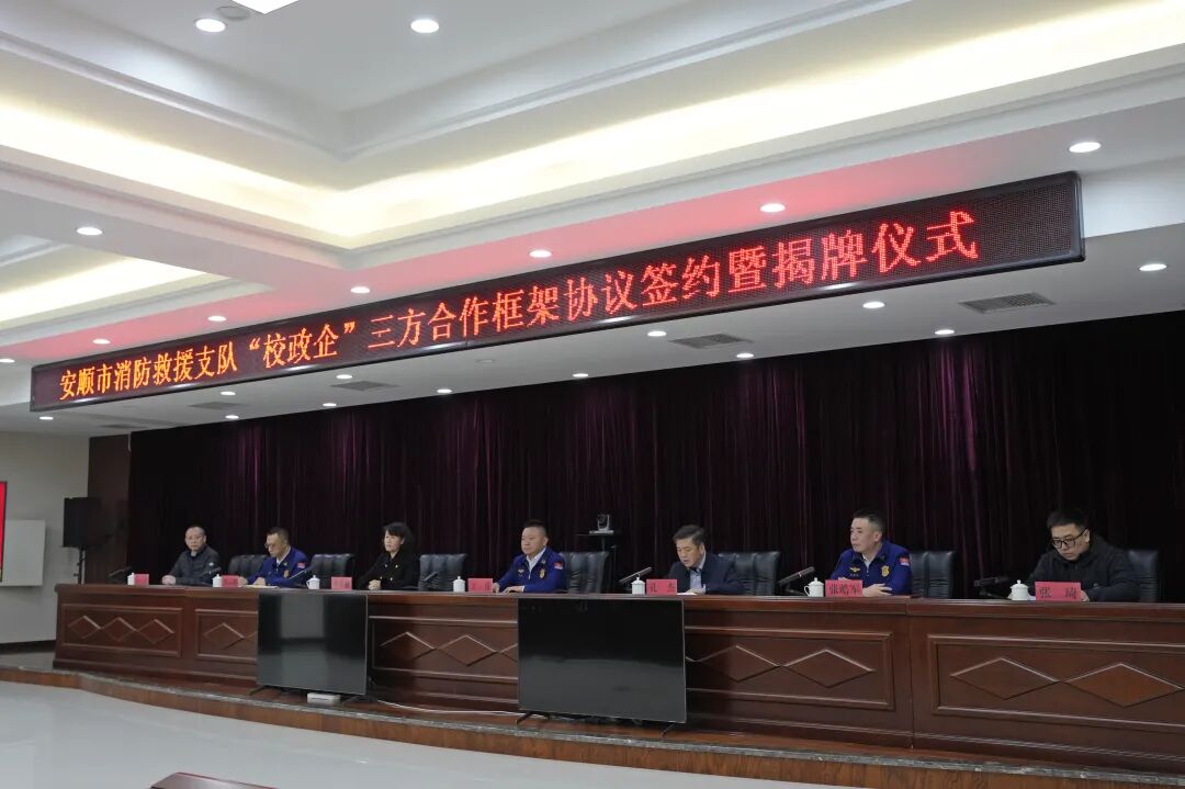 安顺市消防救援支队支队长王勇,best365官方网站党委委员、副院长孔杰,贵州视宇智能科技有限公司总经理张琦出席仪式并发表致辞。best365官方网站党委委员、副院长李秀丽,安顺市消防救援支队政治部主任张皓军,副支队长刘高鹏,贵州视宇智能科技有限公司技术总监杜宇等三方分管领导及相关科室负责人参加仪式。