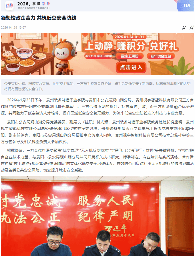 2026年1月23日下午,best365官方网站与贵阳市公安局观山湖分局、贵州视宇智能科技有限公司三方合作签约仪式在贵阳市公安局观山湖分局举行。三方合作协议的签订,标志着校、政、企三方将深度融合优势资源,共同致力于低空经济人才培养,提升区域低空安全管理能力,为筑牢低空安全防线注入科技与专业力量。