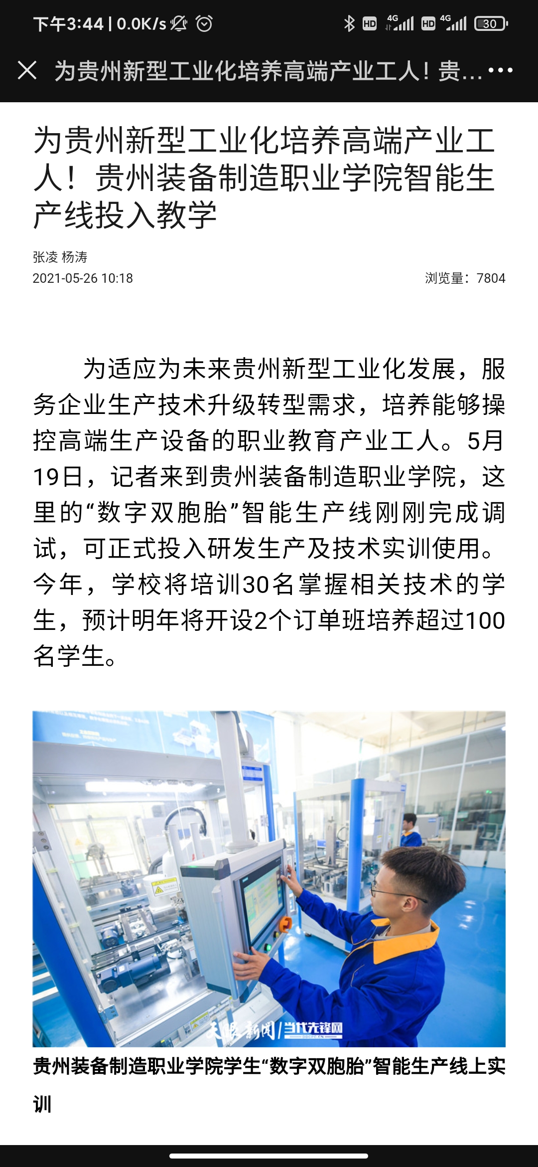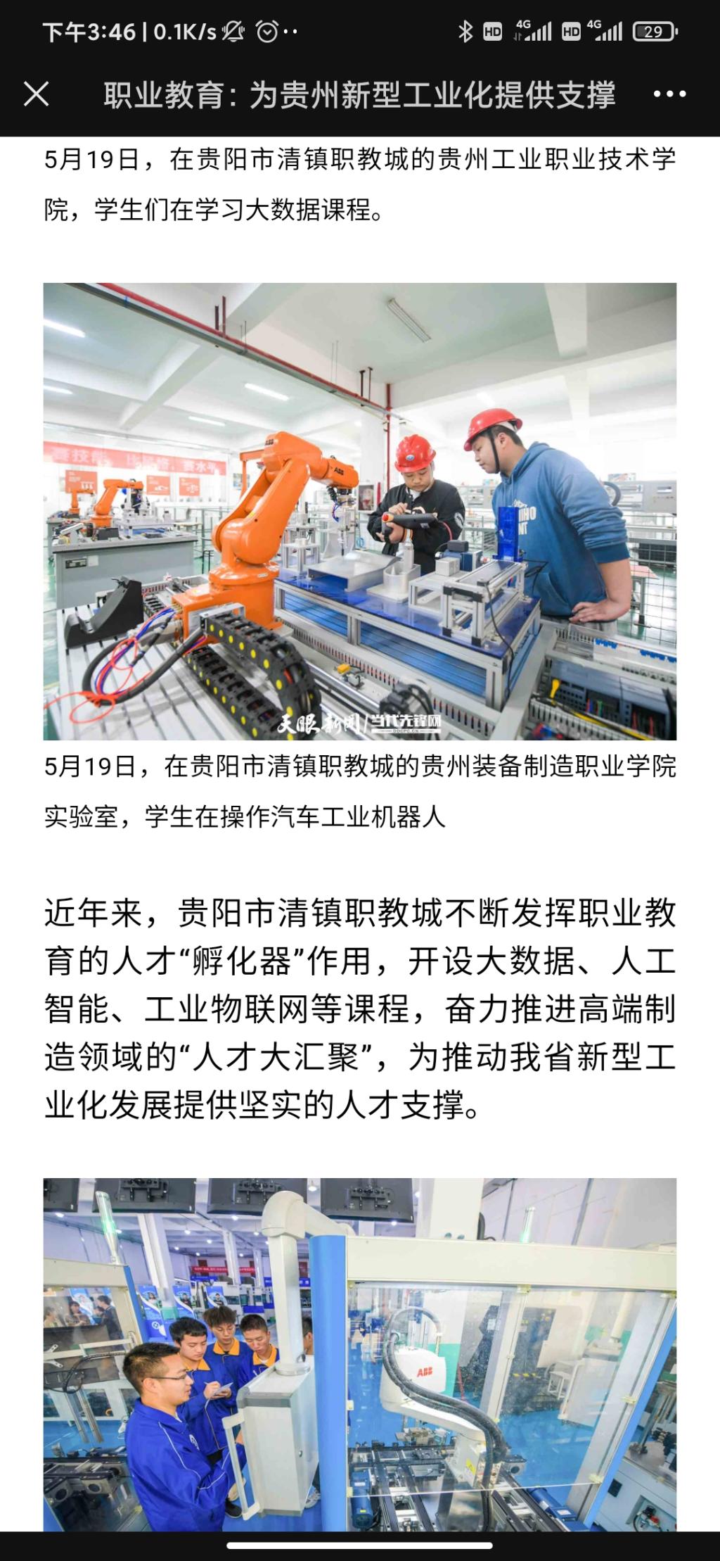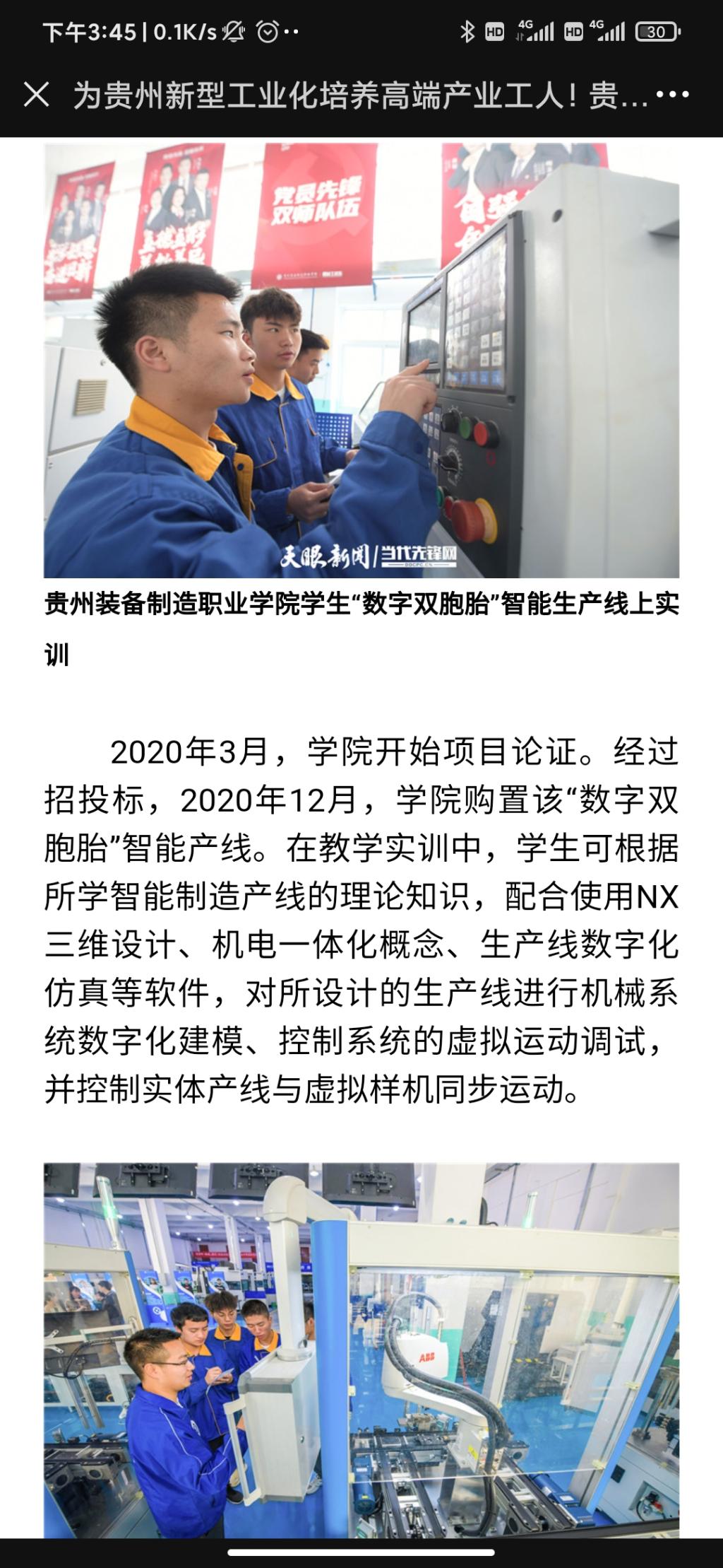 2021年5月26日,天眼新闻以《为贵州新型工业化培养高端产业工人!best365官方网站智能生产线投入教学》为题,全文报道了学院职业教育专业建设、人才培养等内容;2021年5月20日,天眼新闻《职业教育:为贵州新型工业化提供支撑》以图片为重点关注了学院职业教育的发展。
