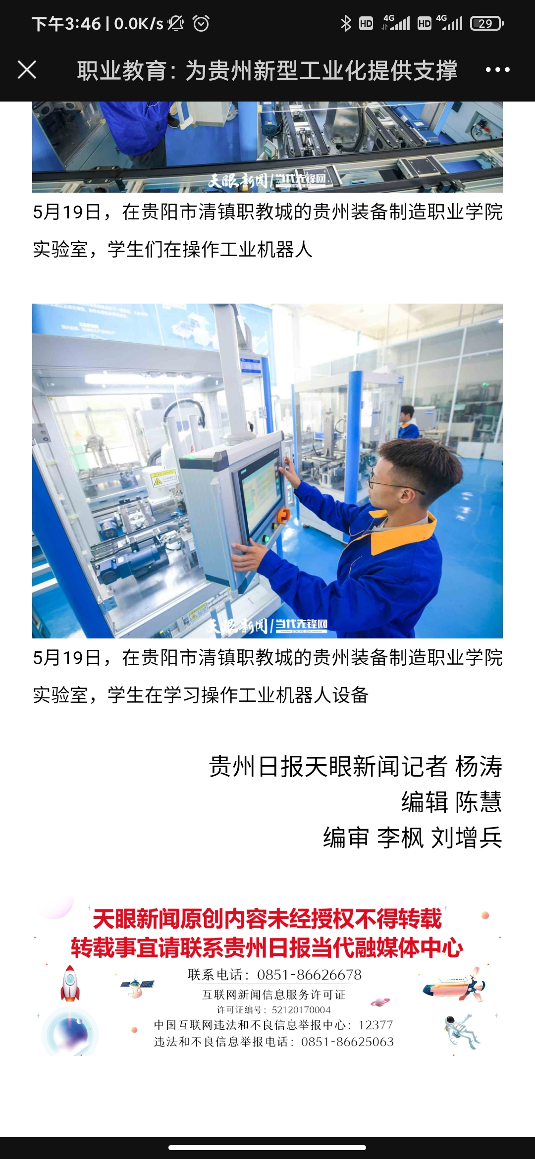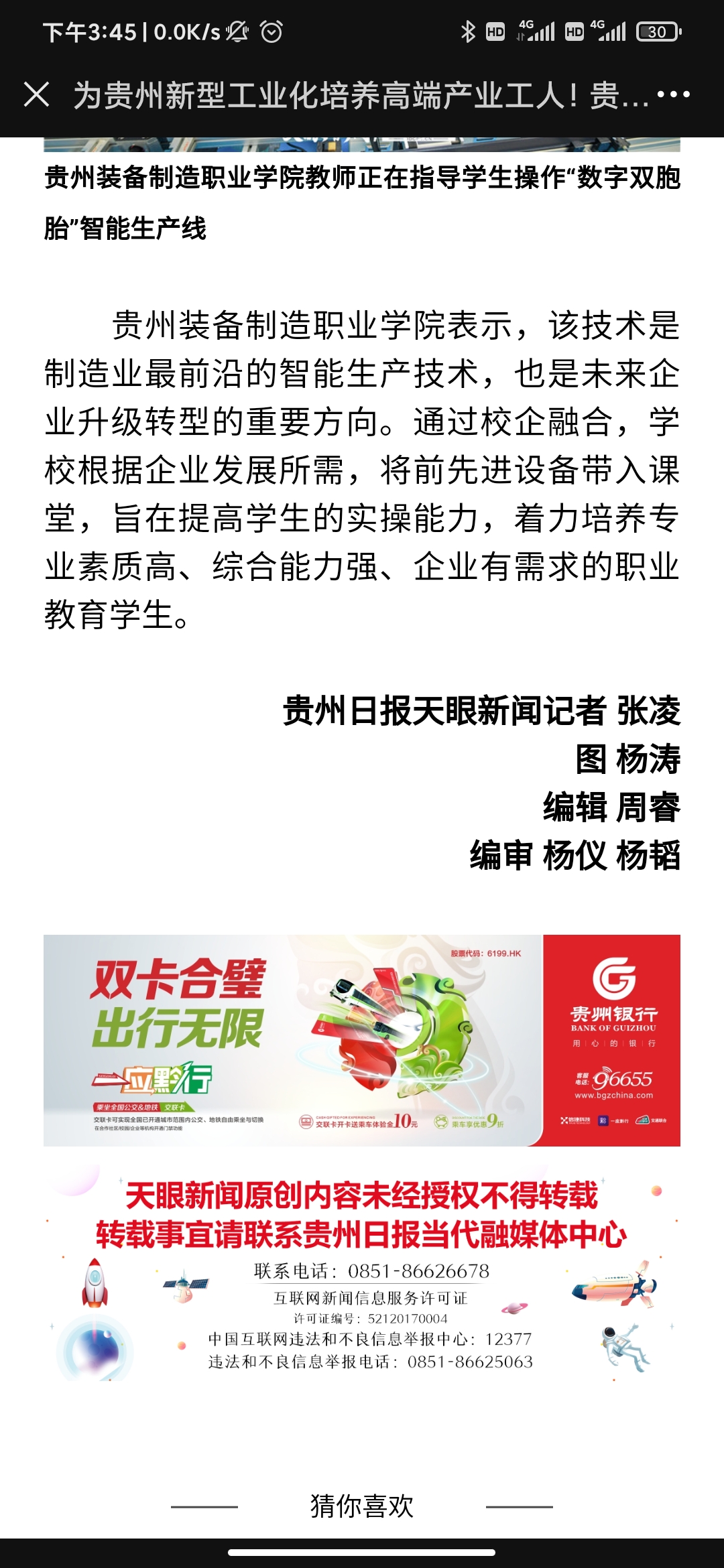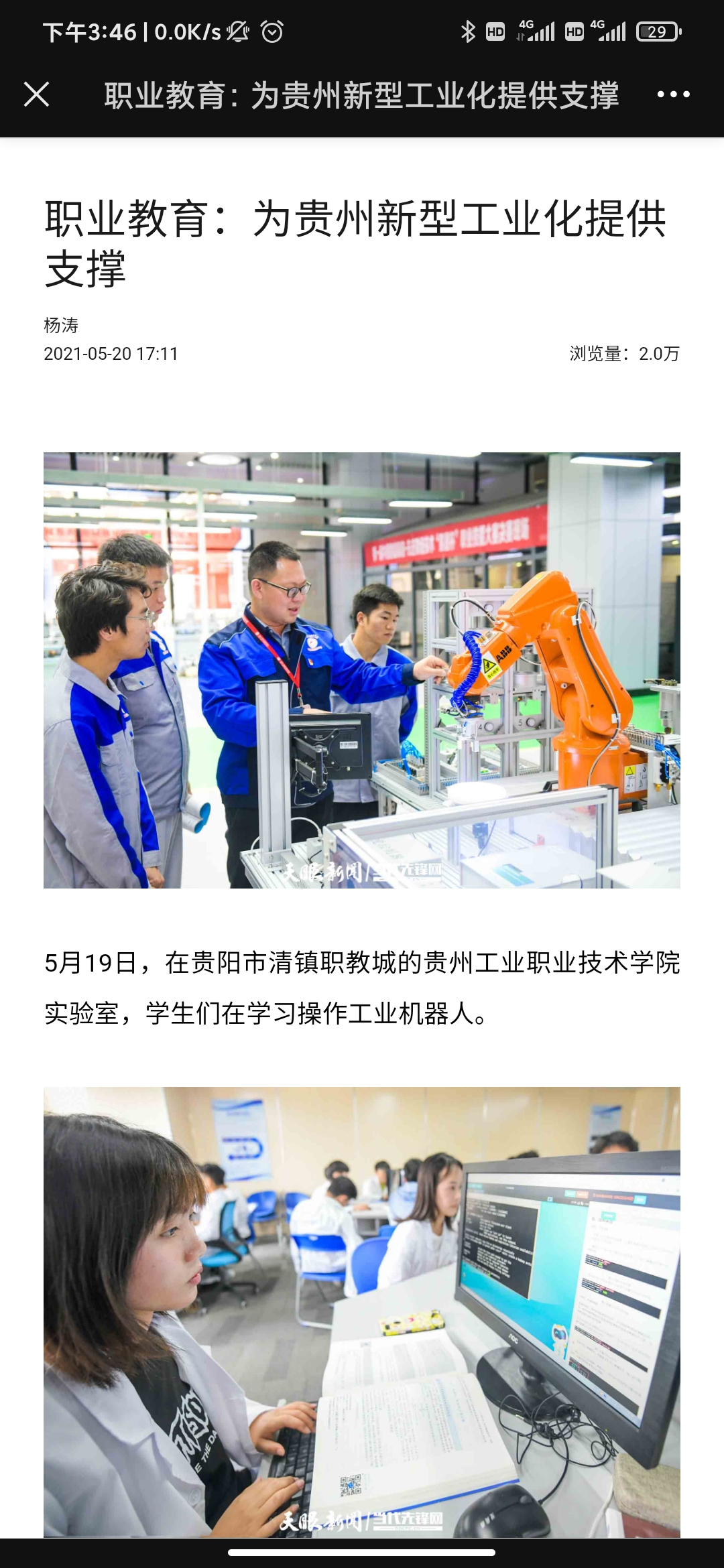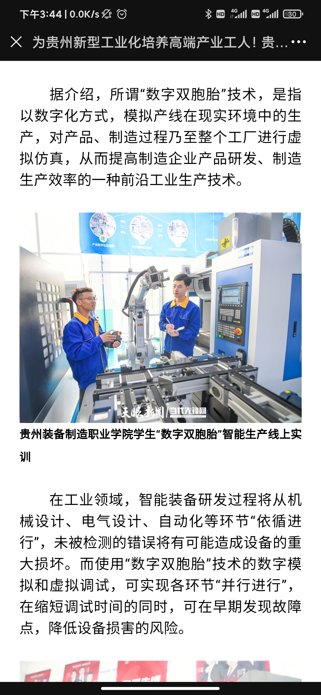 2021年5月26日,天眼新闻以《为贵州新型工业化培养高端产业工人!best365官方网站智能生产线投入教学》为题,全文报道了学院职业教育专业建设、人才培养等内容;2021年5月20日,天眼新闻《职业教育:为贵州新型工业化提供支撑》以图片为重点关注了学院职业教育的发展。