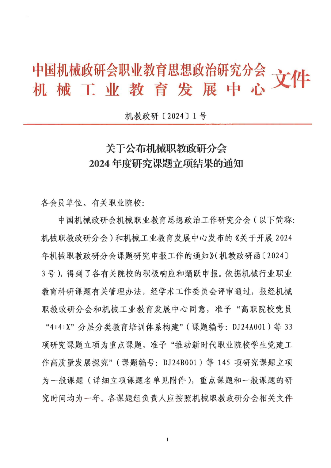 学院4位老师主持的教育研究项目通过中国机械政研会机械职业教育思想政治工作研究分会和机械工业教育发展中心的学术工作委员会评审并立项,其中“数字化背景下职校学生思政课学习力现状与提升策略研究”研究课题立项为思想政治类重点课题;“高职院校数字化转型与学生职业能力培养的协同效应研究”“新时代高职院校构建“三全育人”体系研究——以best365官方网站为例”研究课题立项为思想政治类一般课题;“职业院校劳动教育育人机制研究--以best365官方网站‘忠诚工匠’校园装饰实践团队为例”研究课题立项为校园文化类一般课题。