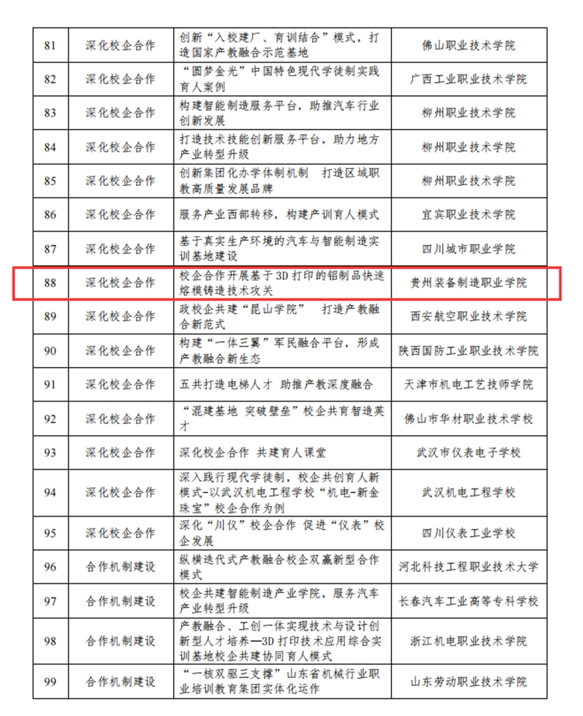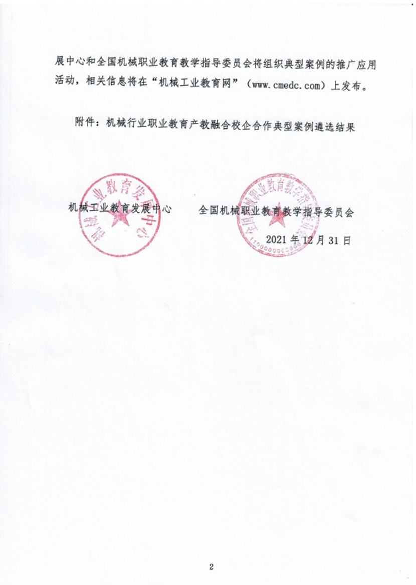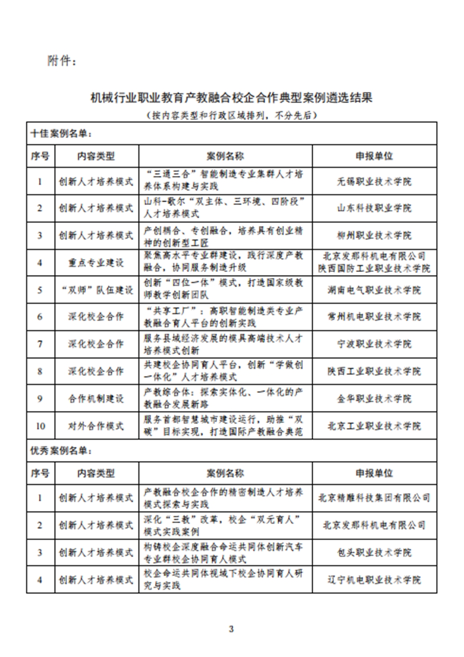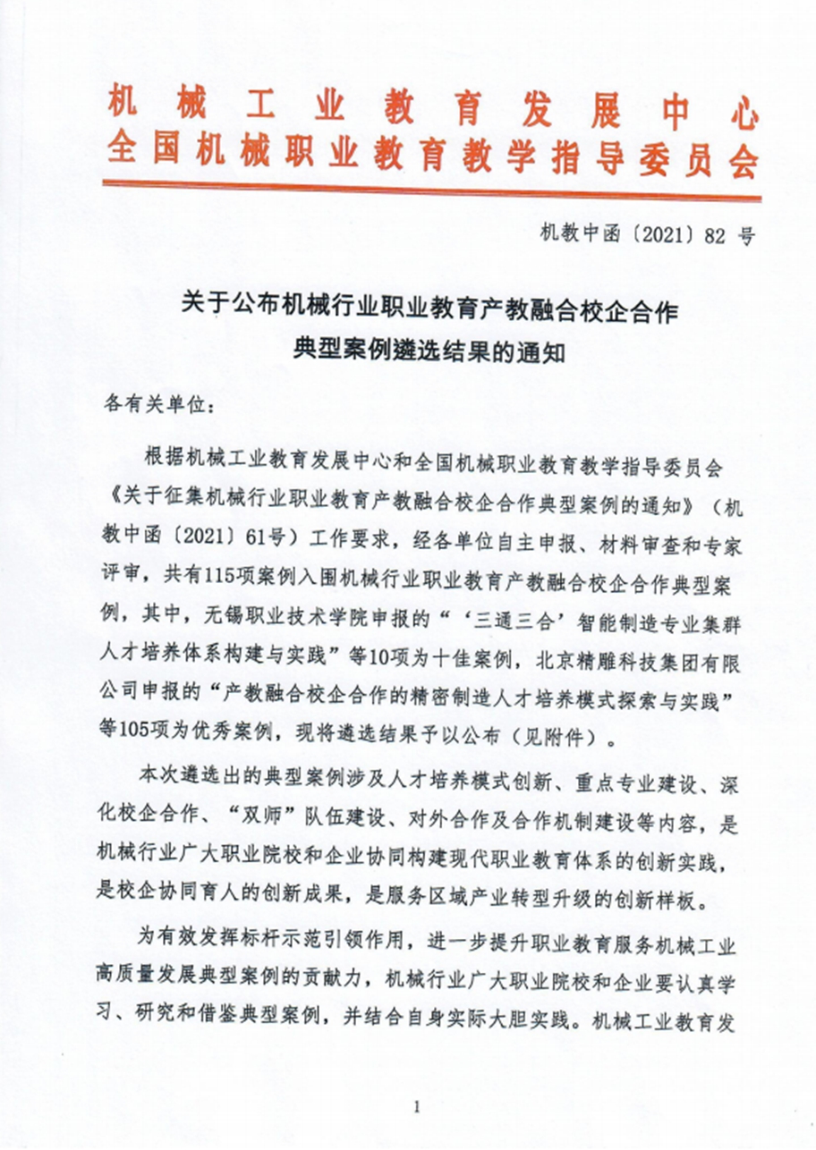 best365官网参加机械工业教育发展中心和全国机械职业教育教学指导委员会组织的职业教育产教融合校企合作典型案例申报,经材料审查和专家评审,共有115项案例入围机械行业职业教育产教融合校企合作典型案例,其中,best365官网申报的案例《校企合作开展基于3D打印的铝制品快速熔模铸造技术攻关》获优秀案例。