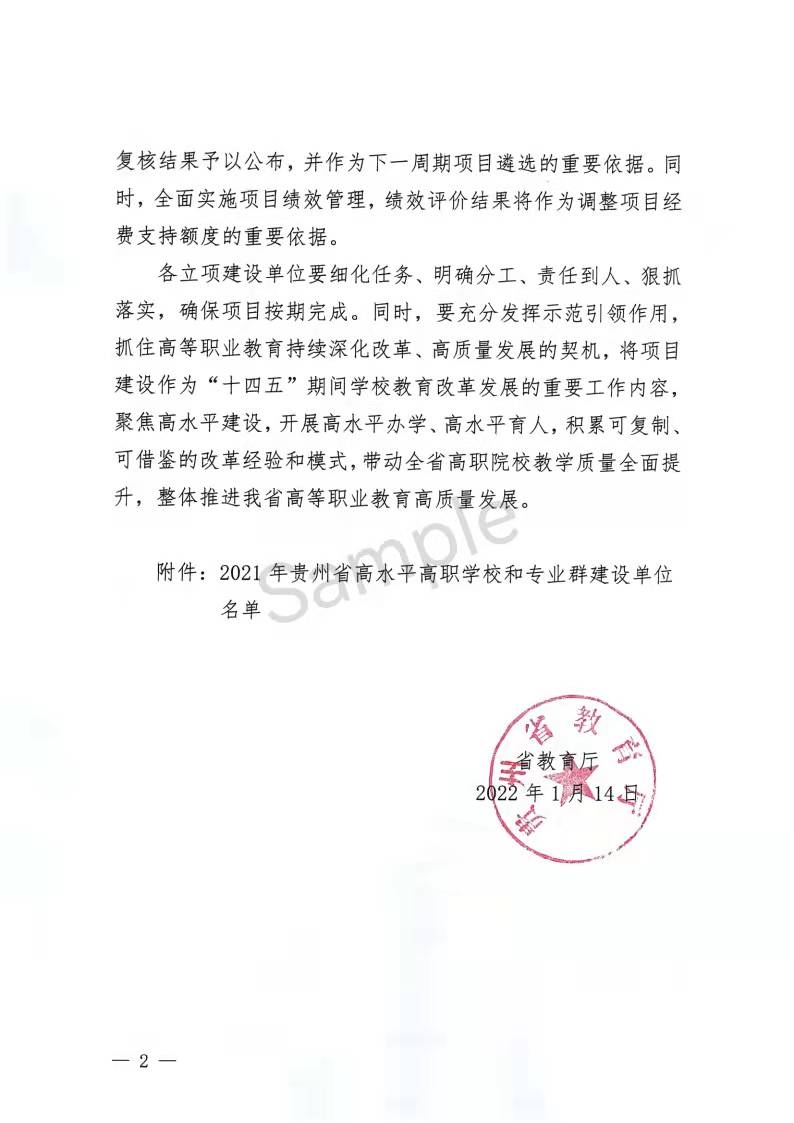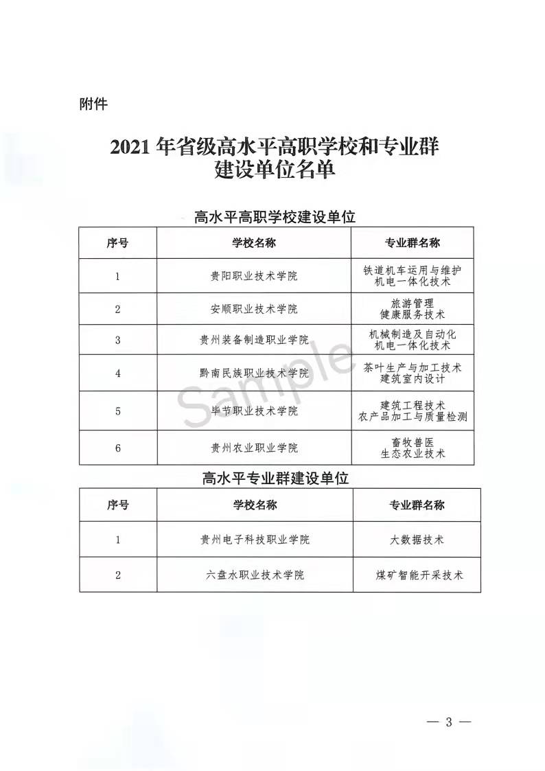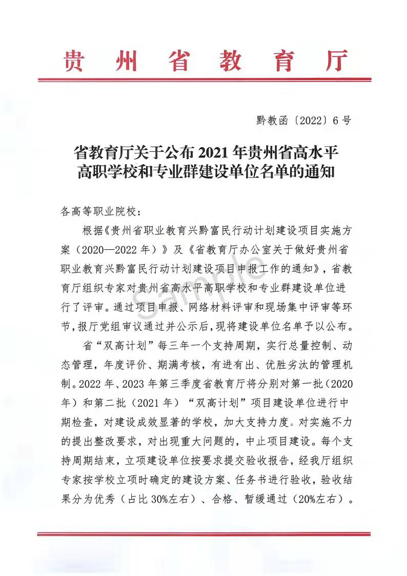 2022年1月14日,贵州省教育厅公布2021年贵州省高水平高职学校和专业群建设单位名单,通过项目申报、网络材料评审和现场集中评审等环节,共有8所单位成功入选,其中高水平高职学校建设单位6个,高水平专业群建设单位2个,best365官网成功入选省级高水平高职学校建设计划,机械制造及自动化机电一体化技术专业群成功入选省级高水平专业群建设计划。