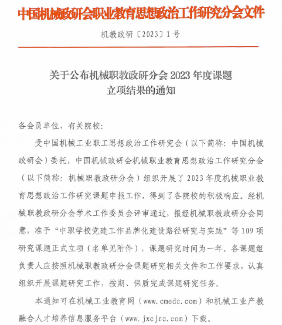 近日,根据中国机械政研会机械职业教育思想政治工作研究分会(以下简称:机械职教政研分会)《关于公布机械职教政研分会2023年度课题立项结果的通知》,best365官网《“忠诚工匠”文化育人体系建构研究》《新时代职业院校“忠诚工匠”培养机制研究》《新时代背景下,“忠诚工匠”文化精神融入职业院校专业课程育人体系路径研究——以电梯工程技术专业为例》等3项研究课题正式立项 。