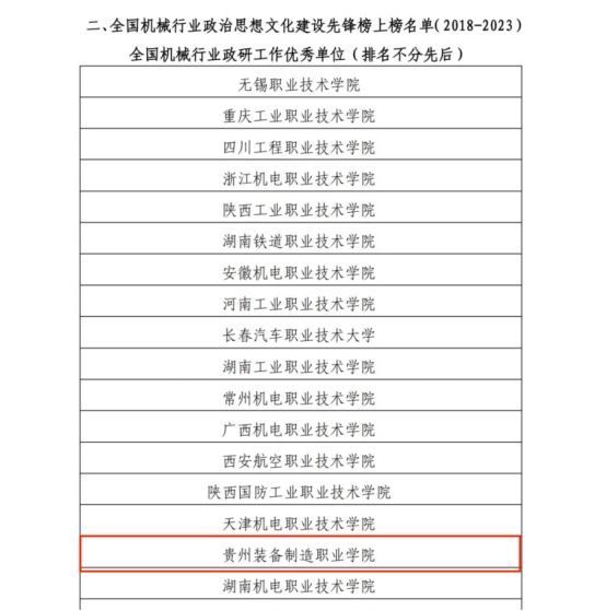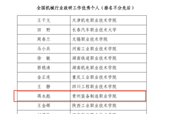 近日,中国机械工业职工思想政治工作研究会(以下简称:中国机械政研会)第十一次会员大会在广西柳州召开。学校党委书记熊星当选中国机械政研会第十一届理事会理事,学校荣获全国机械行业政研工作优秀单位(2018-2023)称号、学校《“忠诚工匠”精神的构建》获得全国机械行业政治思想文化建设创新三类成果奖,学校党委委员、宣传统战部部长蒋永彪被评为全国机械政研工作优秀个人(2018-2023)。
