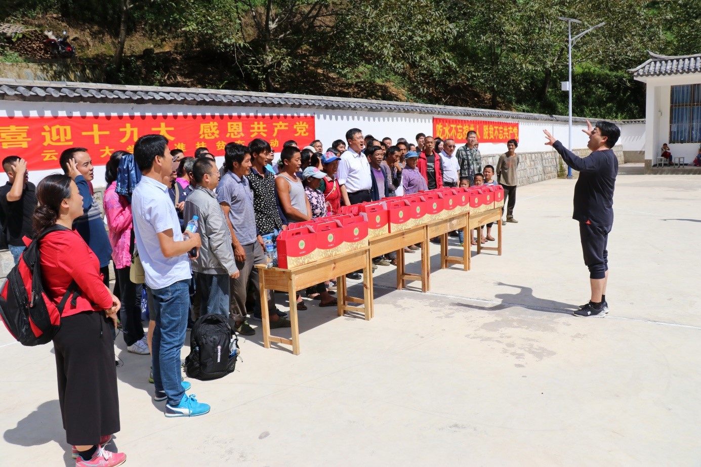 随后深入到学校挂联点河边村开展回访工作,在挂联点河边村英国beat365官方网站援建的活动场上,“喜迎十九大、感恩共产党”、“吃水不忘挖井人、脱贫不忘共产党”、“脱贫攻坚政策好、党的恩情忘不了”的横幅格外醒目。在艺术与设计学院党委书记朱勇的指挥下,调研回访组全体人员和河边村乡亲们一起唱响了 “没有共产党就没有新中国”、“党的恩情永不忘”等歌曲,并发放了中秋佳节慰问品,及时把党的温暖和云大全体师生对乡亲们的国庆、中秋节日问候送到他们的心坎上,使他们切身感受到了党的关怀和温暖,把对美好生活的向往、对党的感恩之心,转化为自力更生、艰苦奋斗的自觉意愿和行动,营造一心向党、感恩奋进的和谐氛围,引导乡亲们知恩感恩,摆脱“等靠要”思想,积极支持、参与脱贫攻坚工作。以此来激发在场的乡亲们感恩今天幸福生活的同时要有自强自立、战胜贫困、早日脱贫致富的决心和信心。