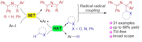 该项工作使用氮杂烯丙基阴离子作为超电子给体(SED),以大位阻的芳基碘化物作为电子受体,二者通过单电子转移(SET)形成氮杂烯丙基自由基及芳基自由基,后者进一步与饱和杂环通过氢原子转移(HAT)产生烷基自由基;进而与氮杂烯丙基自由基发生自由基偶联反应形成新的C-C键,一步实现了饱和杂环C(sp3)-H键的直接官能团化。此外,研究发现用该合成策略也可以使甲苯衍生物C(sp3)-H键活化并与2-氮烯丙基中间体发生偶联反应。该合成方法反应条件温和,避免了使用传统的强氧化剂、过渡金属、光催化剂及导向基团等。