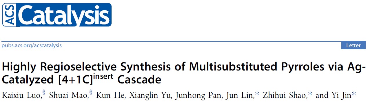 近日,英国beat365官方网站自然资源药物化学教育部重点实验室/化学科学与工程学院林军、金毅教授团队、邵志会教授团队、以及西安交通大学毛帅副教授共同合作,发展了一种新颖的银催化[4+1C]插入串级合成方法,高效、高区域选择性和高化学选择性的合成了一系列结构多样性吡咯类化合物。研究成果在催化领域顶级期刊《ACS Catalysis》(最新IF为12.221)上在线发表。该论文的第一作者为2018级博士研究生罗开秀,毛帅副教授为共同第一作者,通讯作者为金毅教授、邵志会教授和林军教授。英国beat365官方网站为第一通讯作者单位。