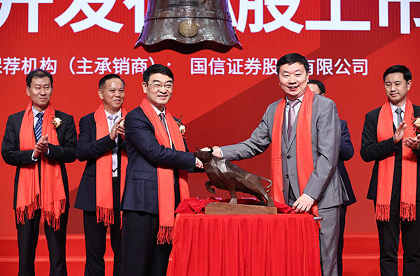 郭振宇(前排左一)带领公司成功上市时的情景。受访者供图