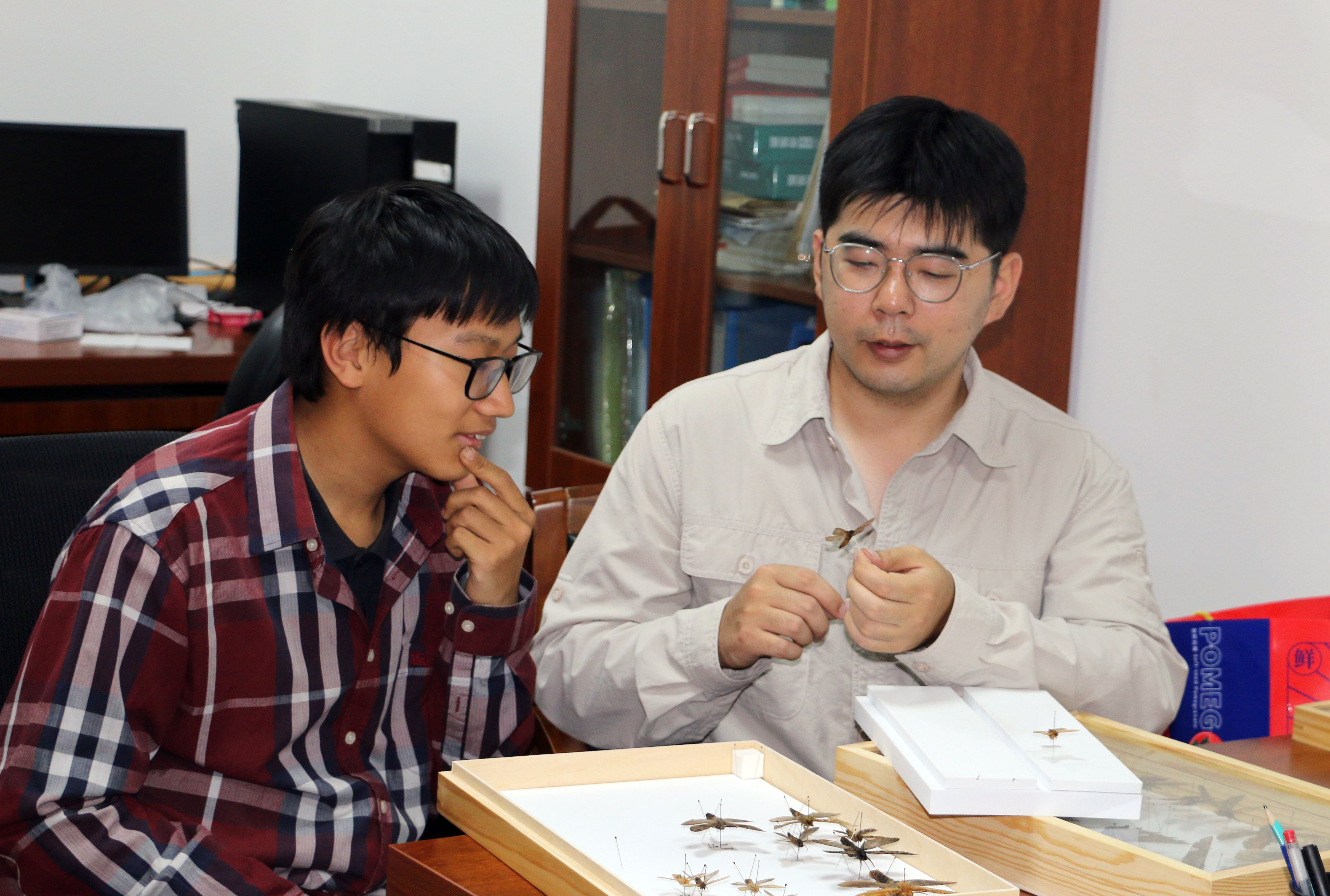 许振邦(右)和杨子义(左)讨论蝙蝠蛾研究