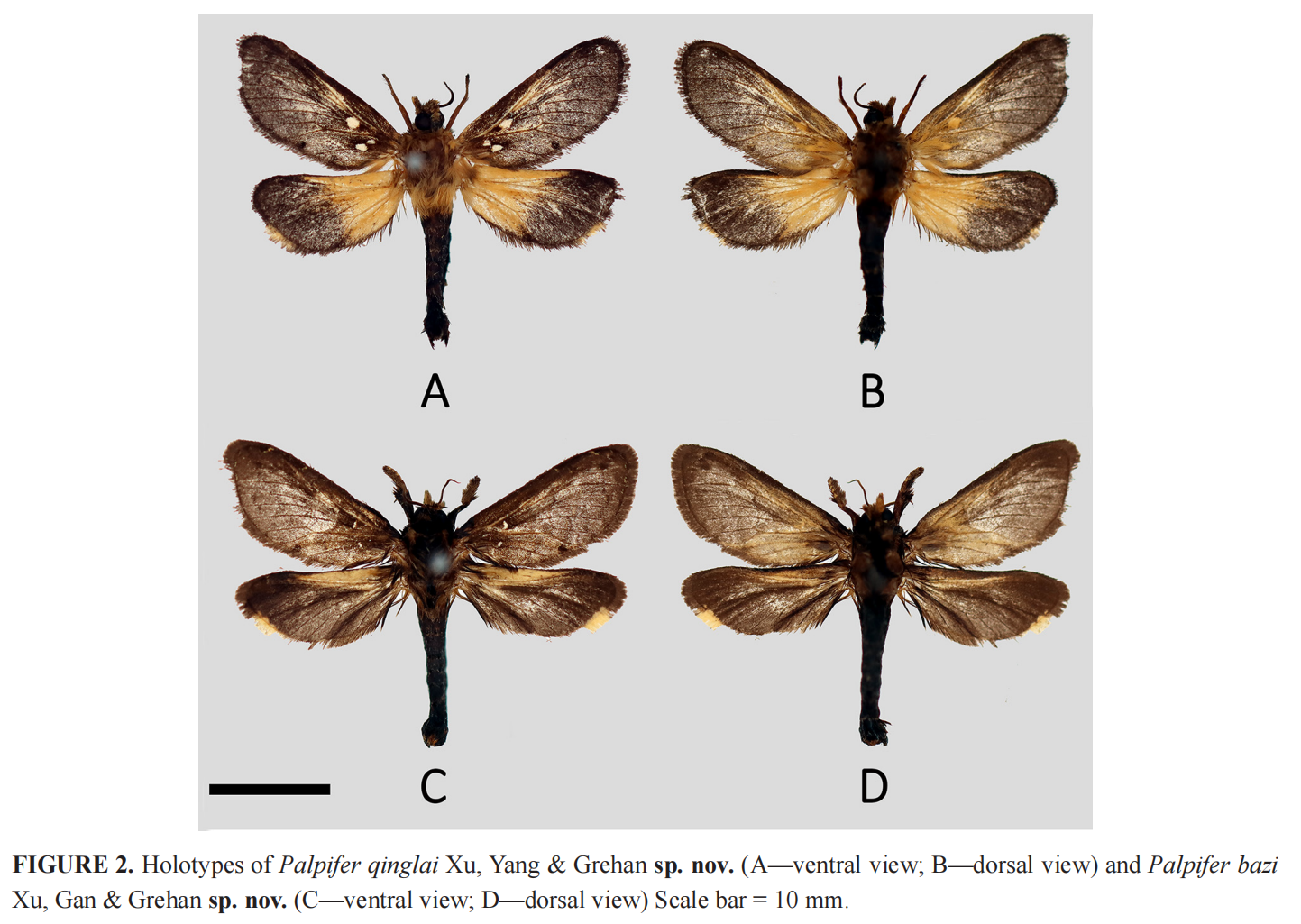 由于长须蝠蛾的研究文献和标本大多由外国研究者完成,国内研究有限,且国内研究多集中在冬虫夏草寄生的虫草蝠蛾药用研究等方面。于是,许、杨与美国昆虫学家John Grehan教授取得联系并开展国际学术协作,获得了大量外国研究者曾发表的蝙蝠蛾分类研究资料,尤其是2023年发表的丽江长须蝠蛾Palpifer climoi以及长须蝠蛾模式物种六点长须蝠蛾P.sexnotatus的相关资料。此外,他们对所采标本的DNA与分子鉴定数据库中的长须蝠蛾DNA进行分子遗传距离计算。最终,通过分子生物学手段辅助形态学分析结果,确认该标本为长须蝠蛾属未被描述的新物种。