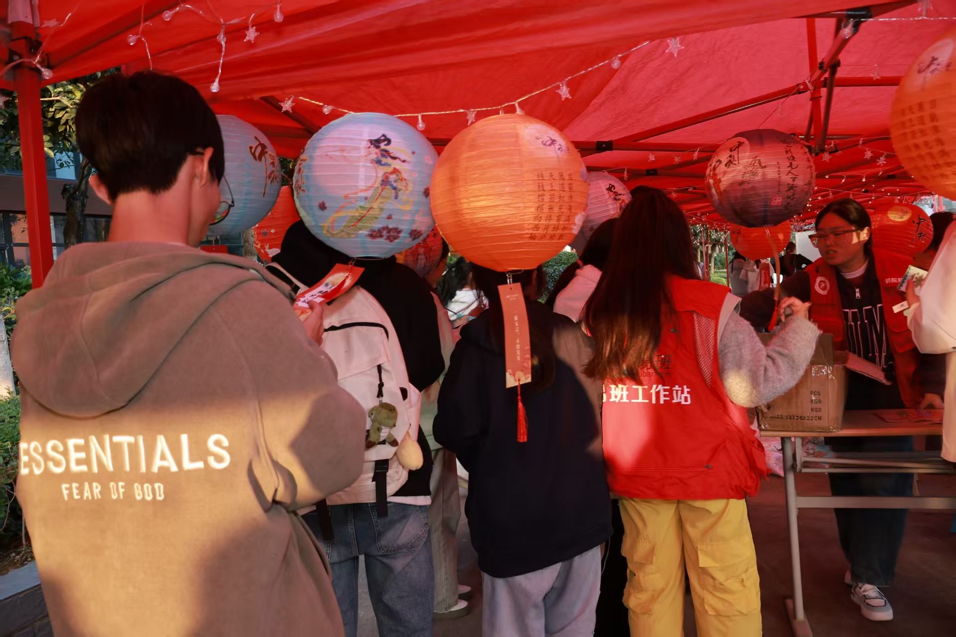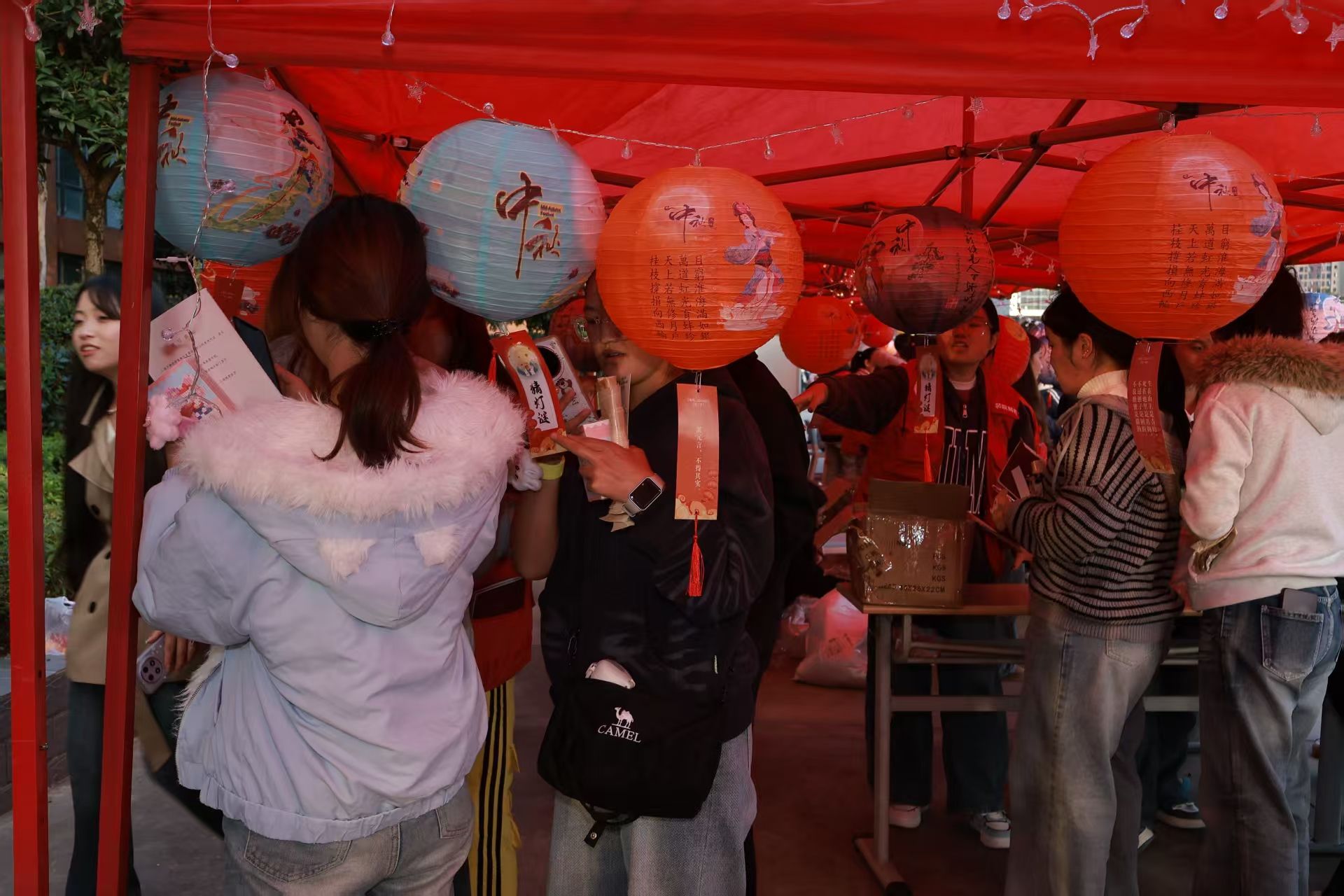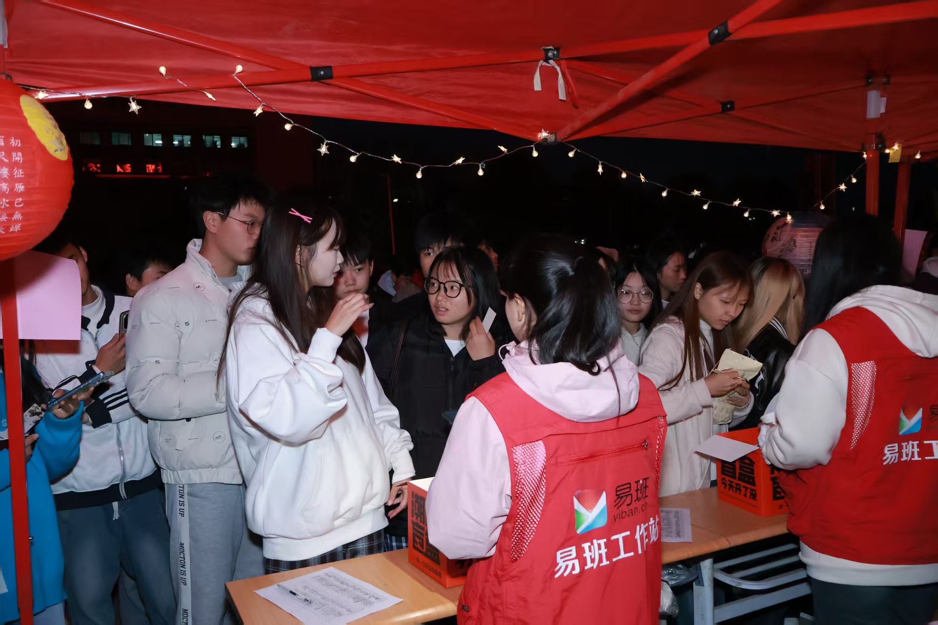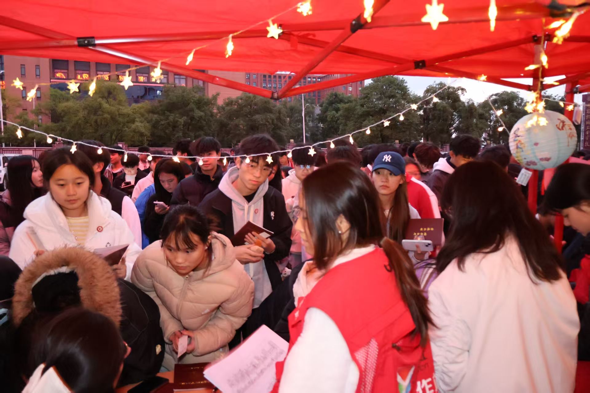 挂满灯谜的区域前,同学们或独自揣摩、或三五成群讨论。“一口咬掉牛尾巴”、“半部春秋”等谜题,藏着汉字精妙。同学们自选作答,每次答对都收获印章,既锻炼思维,更拉近彼此距离,第五枚印章成为智慧见证。