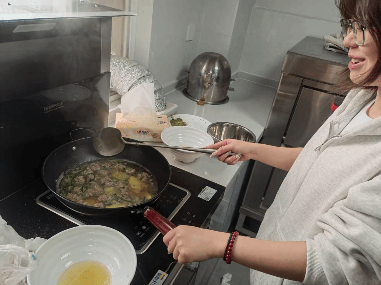 和面、擀皮、调馅……在包饺子区域,同学们手法虽略显生疏,但热情高涨,一个个形态各异的饺子在手中诞生,寓意着生活的百味与团圆的喜庆。在煮汤圆的锅边,热气腾腾的汤圆在沸水中翻滚,圆润饱满,象征着对新一年学业与生活圆满的美好祝愿。更有擅长烹饪的同学大展身手,起锅烧油,颠勺翻炒,一道道色香味俱全的炒菜陆续出锅,赢得了现场阵阵掌声与赞叹。